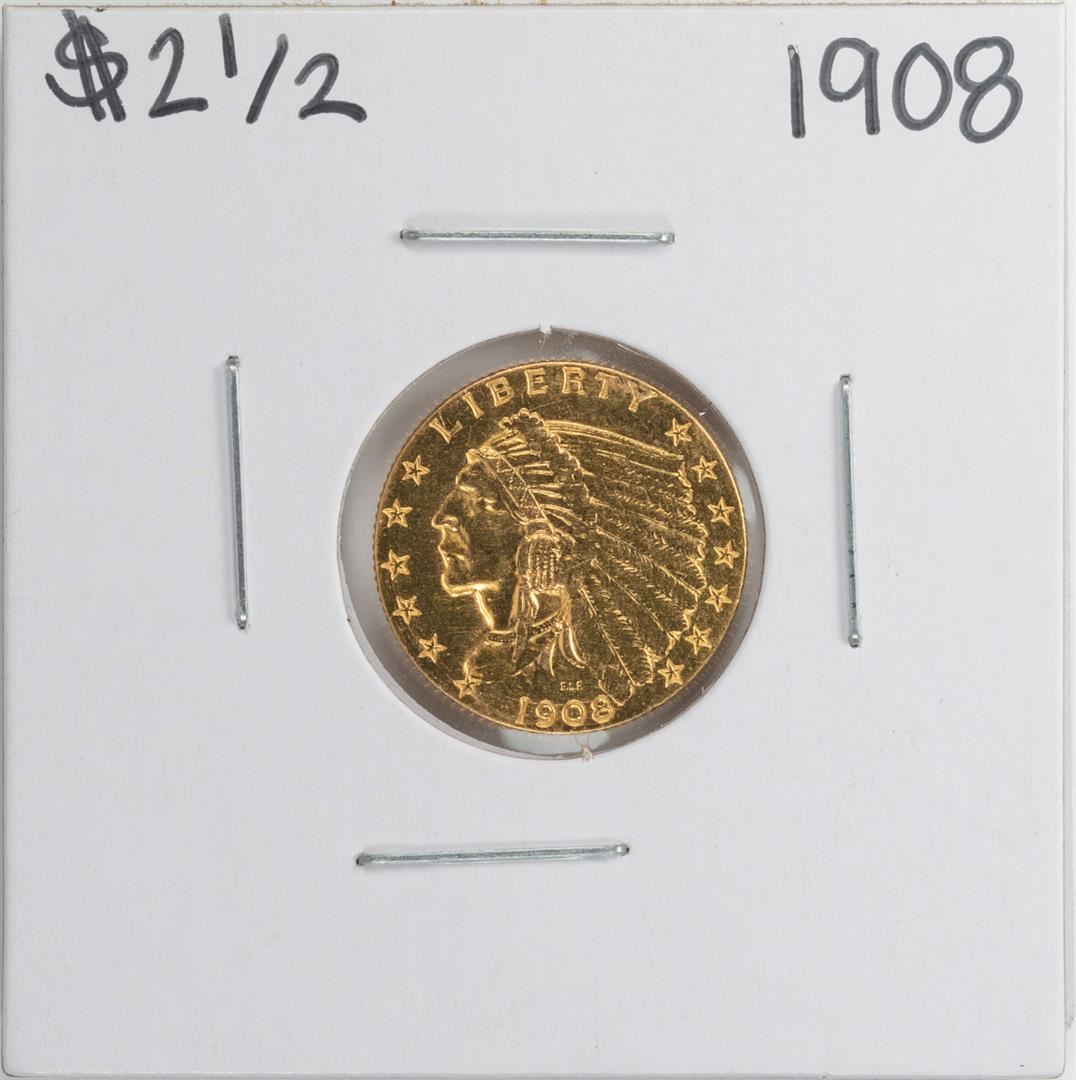 One 1908 $2 1/2 Indian Head Quarter Eagle Gold Coin.