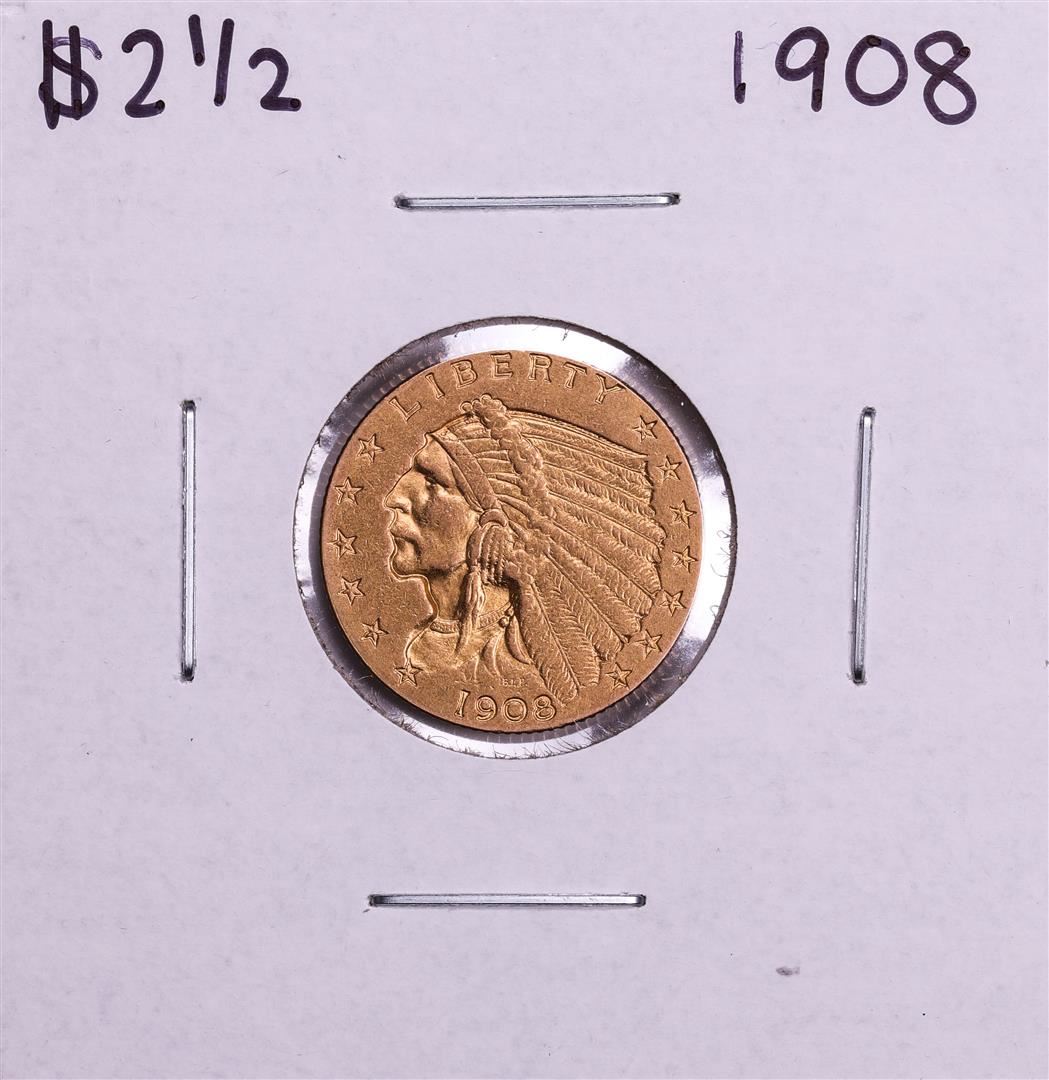One 1908 $2 1/2 Indian Head Quarter Eagle Gold Coin.