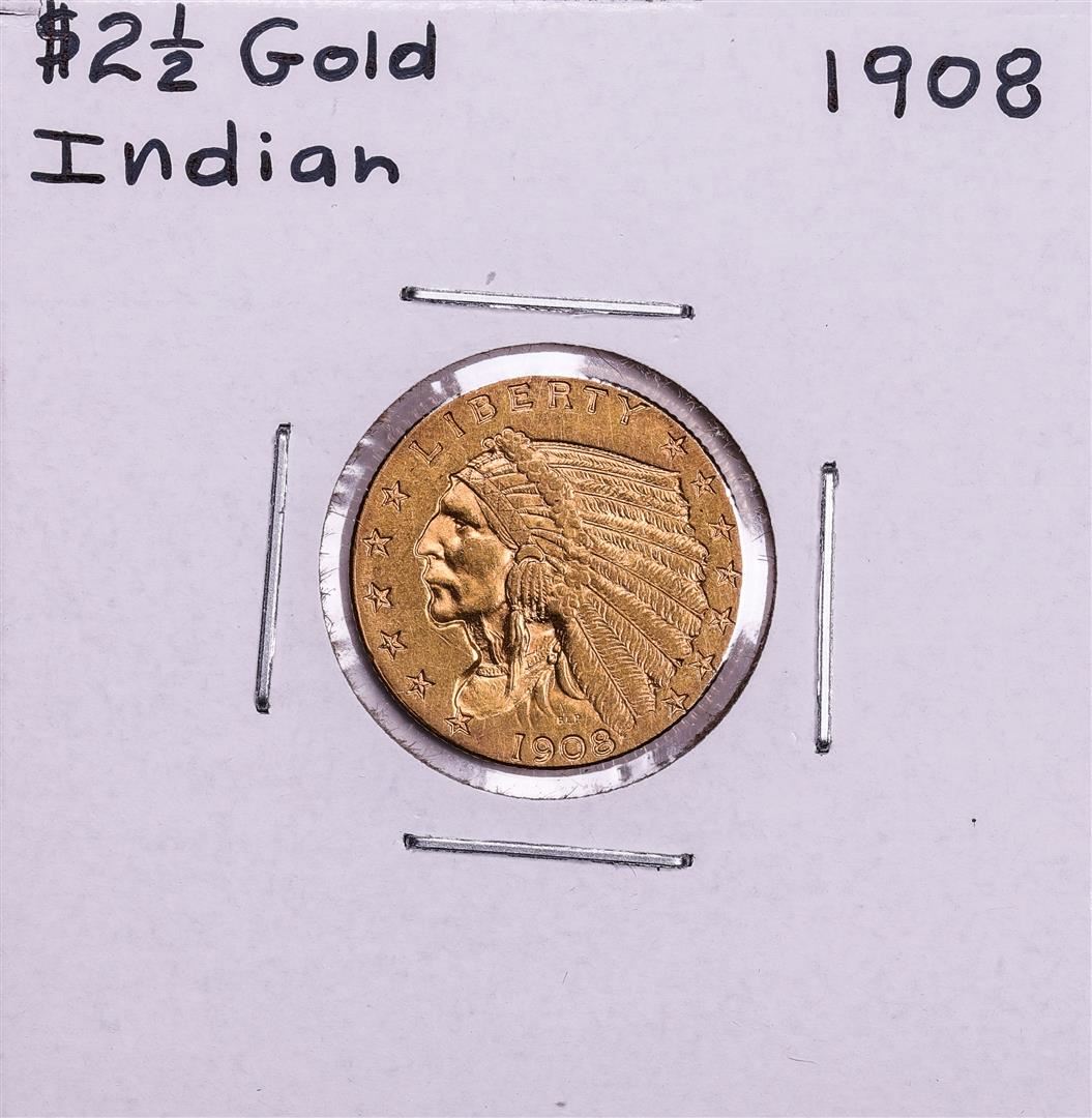 One 1908 $2 1/2 Indian Head Quarter Eagle Gold Coin.