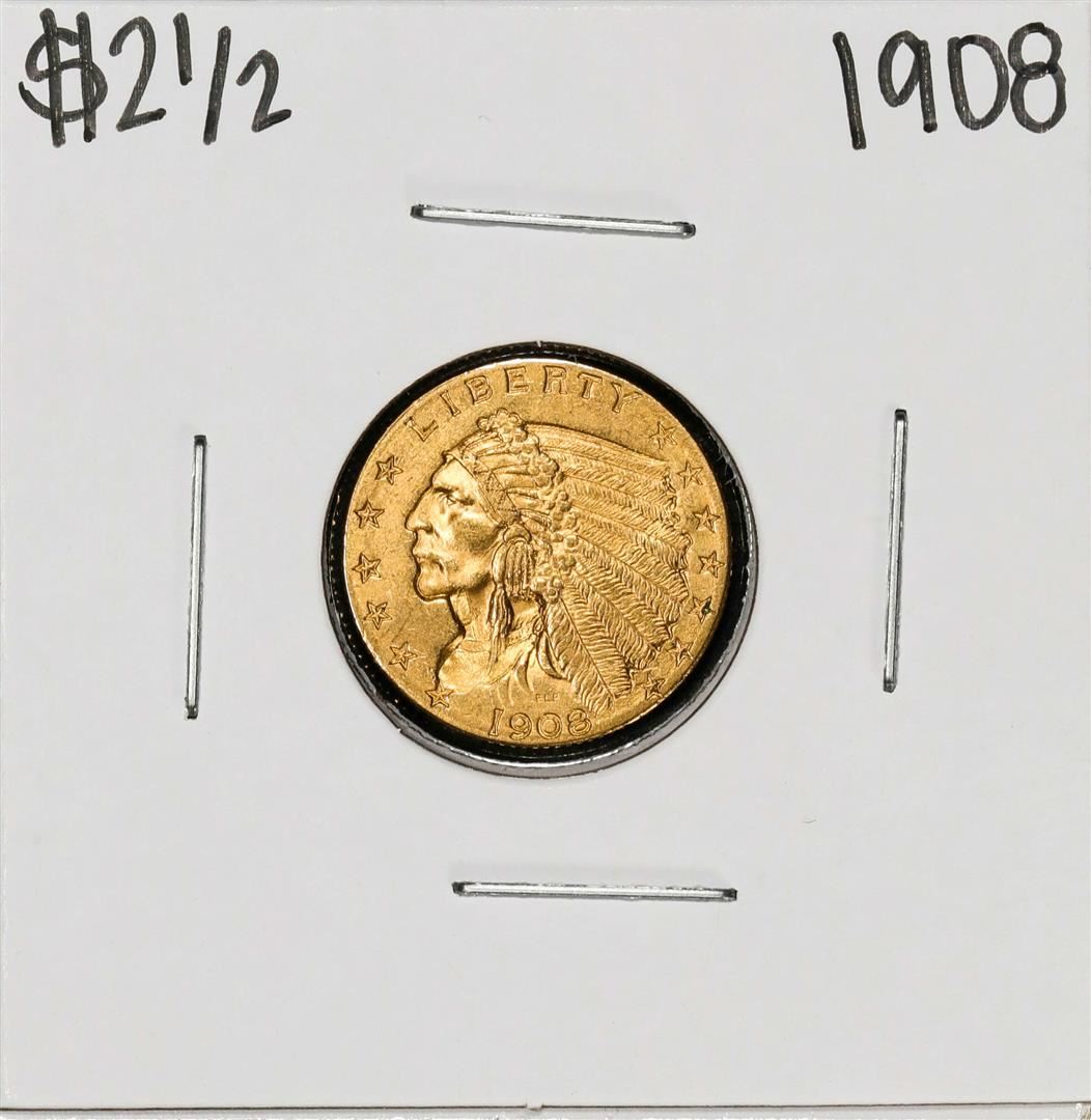 One 1908 $2 1/2 Indian Head Quarter Eagle Gold Coin.