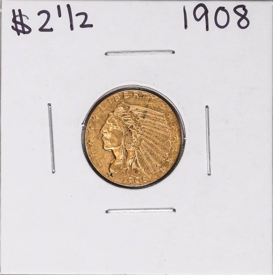 One 1908 $2 1/2 Indian Head Quarter Eagle Gold Coin.