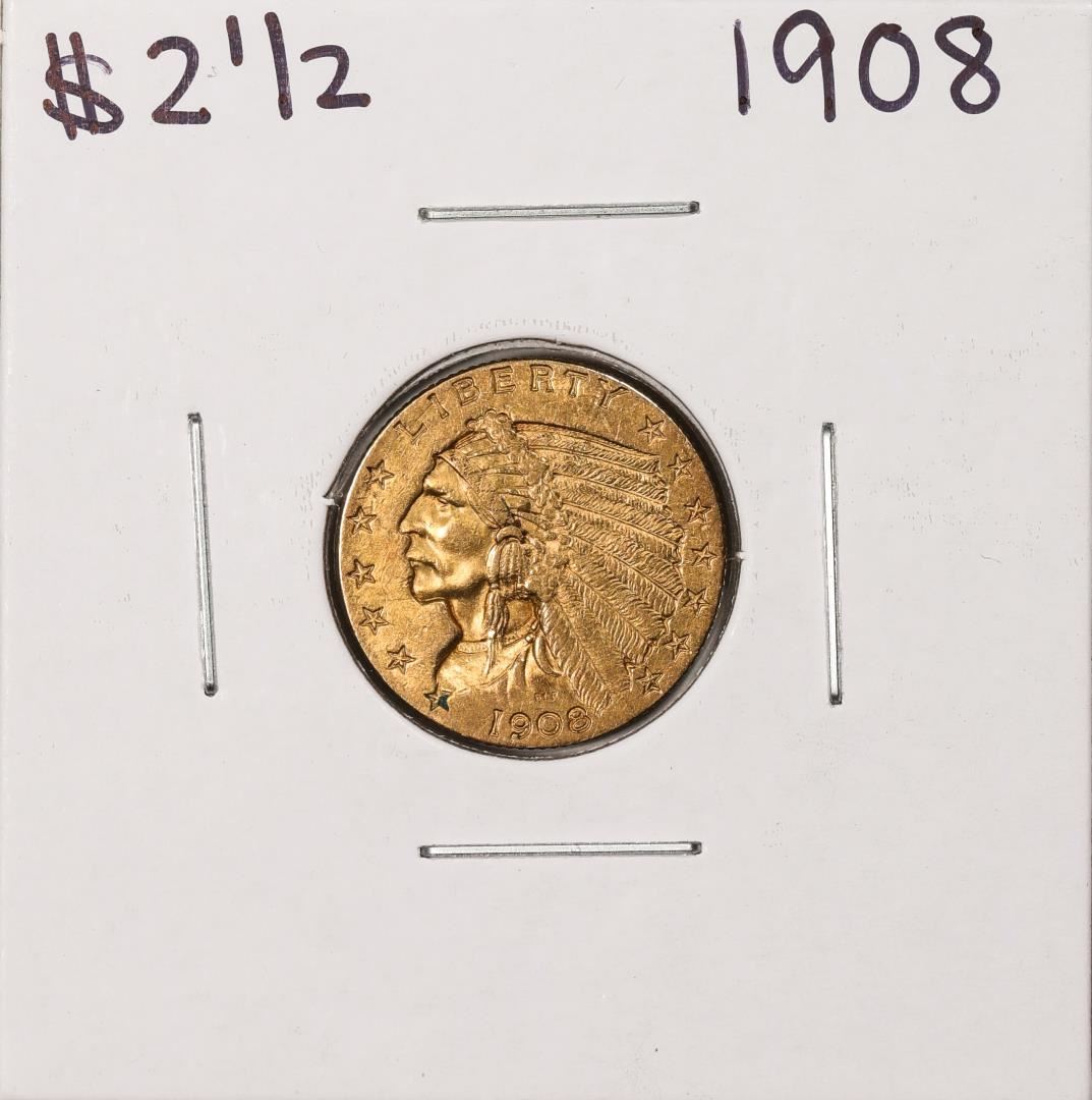 One 1908 $2 1/2 Indian Head Quarter Eagle Gold Coin.