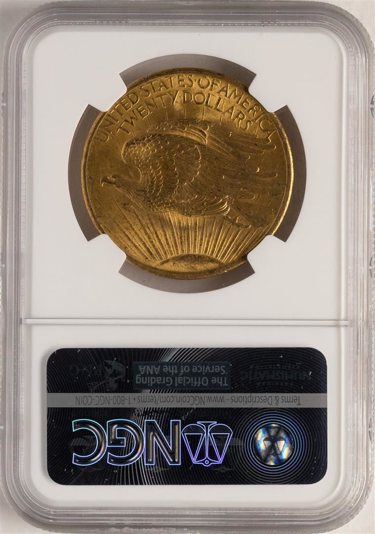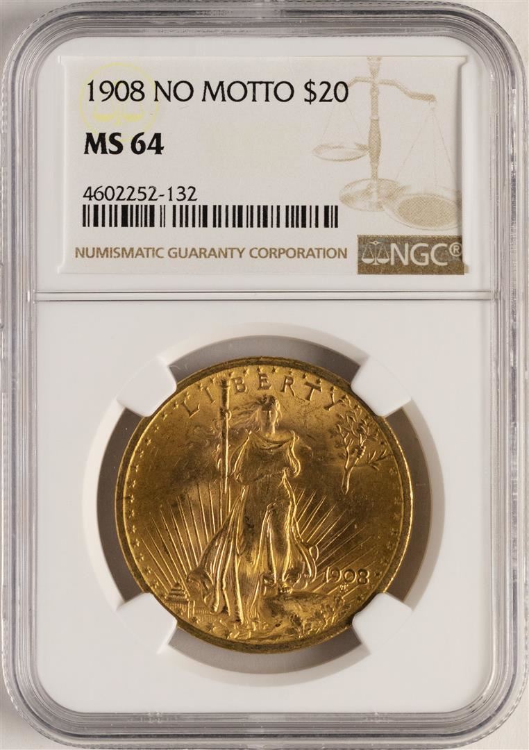 One 1908 $20 No Motto Saint Gaudens Double Eagle Gold Coin NGC MS64. NGC Certified.