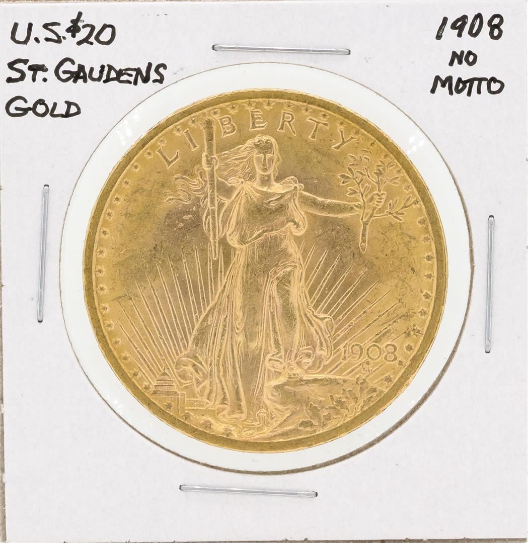 One 1908 $20 No Motto St. Gaudens Double Eagle Gold Coin.