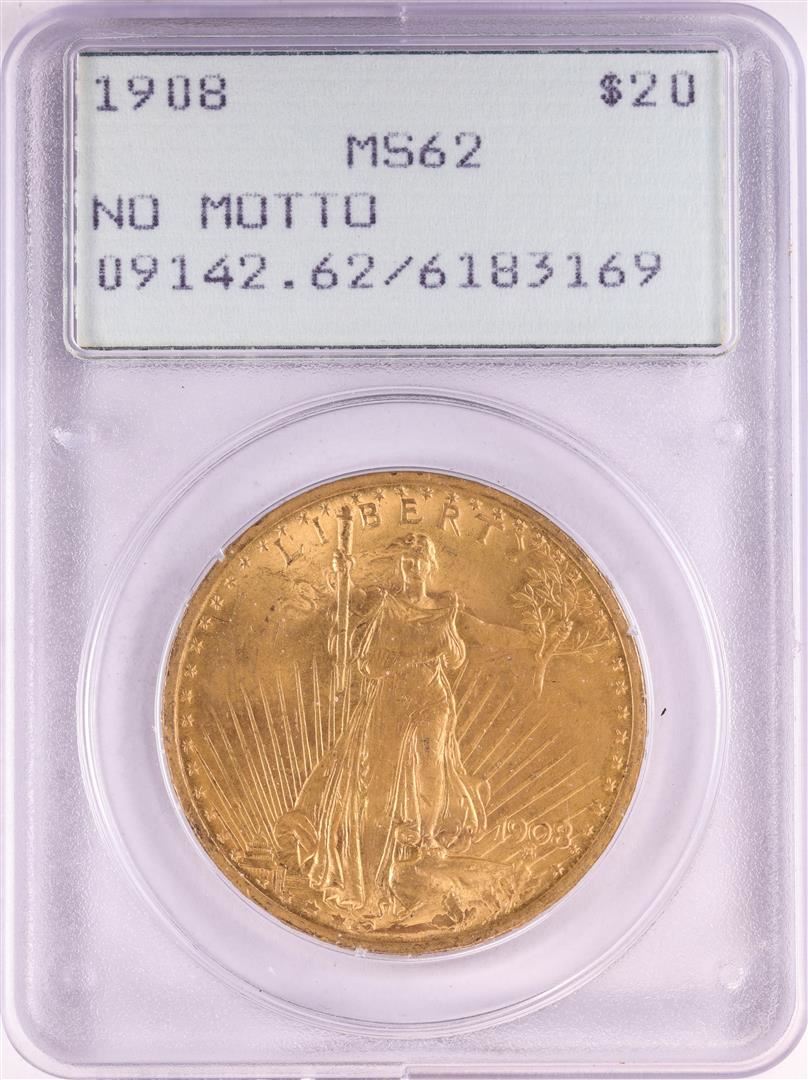 One 1908 $20 St. Gaudens Double Eagle Gold Coin PCGS MS62 Old Green Rattler. PCGS Graded.
