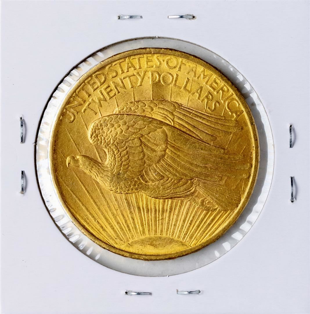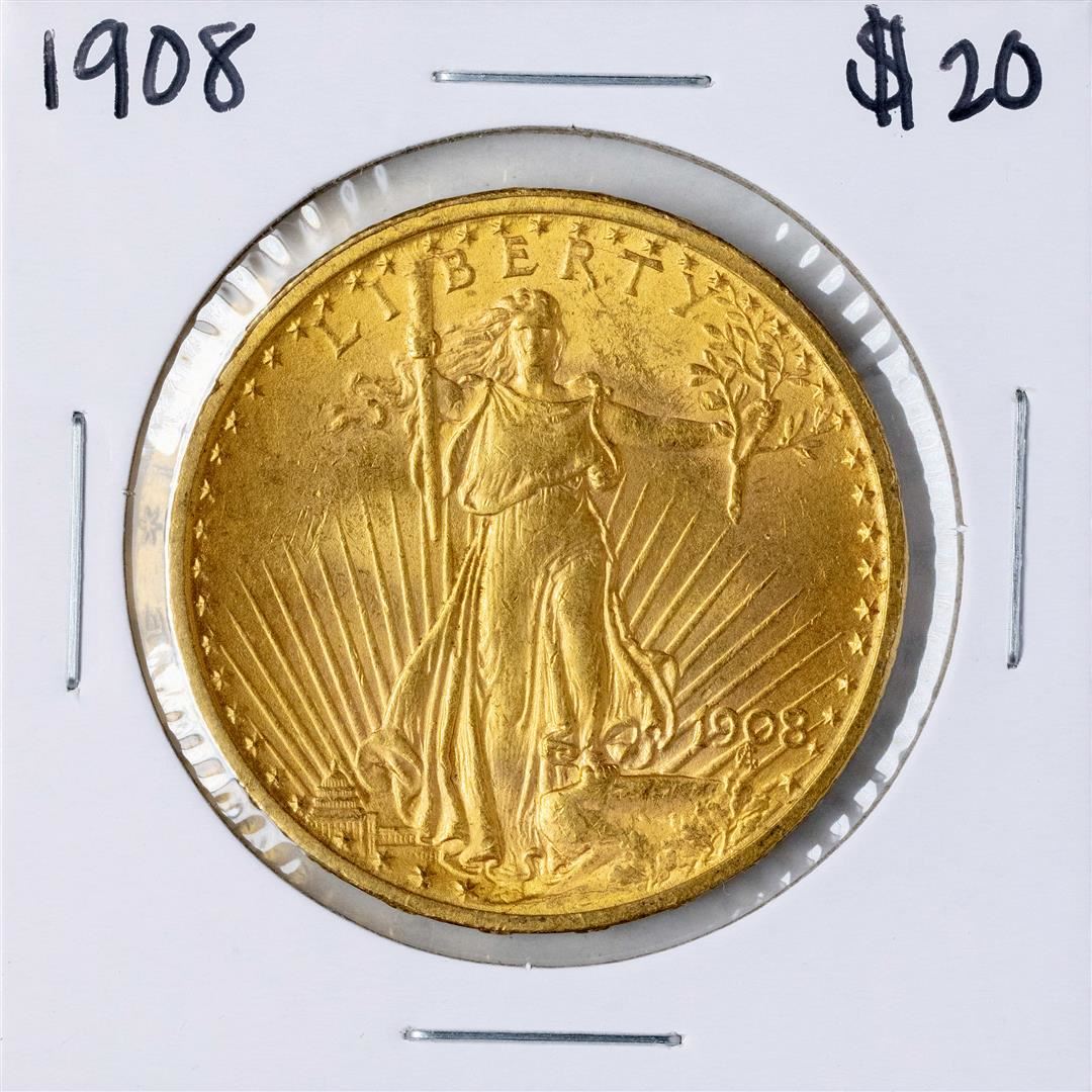 One 1908 $20 St. Gaudens Double Eagle Gold Coin.