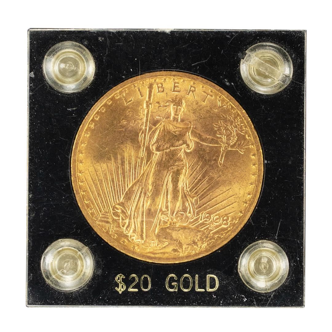 One 1908 $20 St. Gaudens Double Eagle Gold Coin.