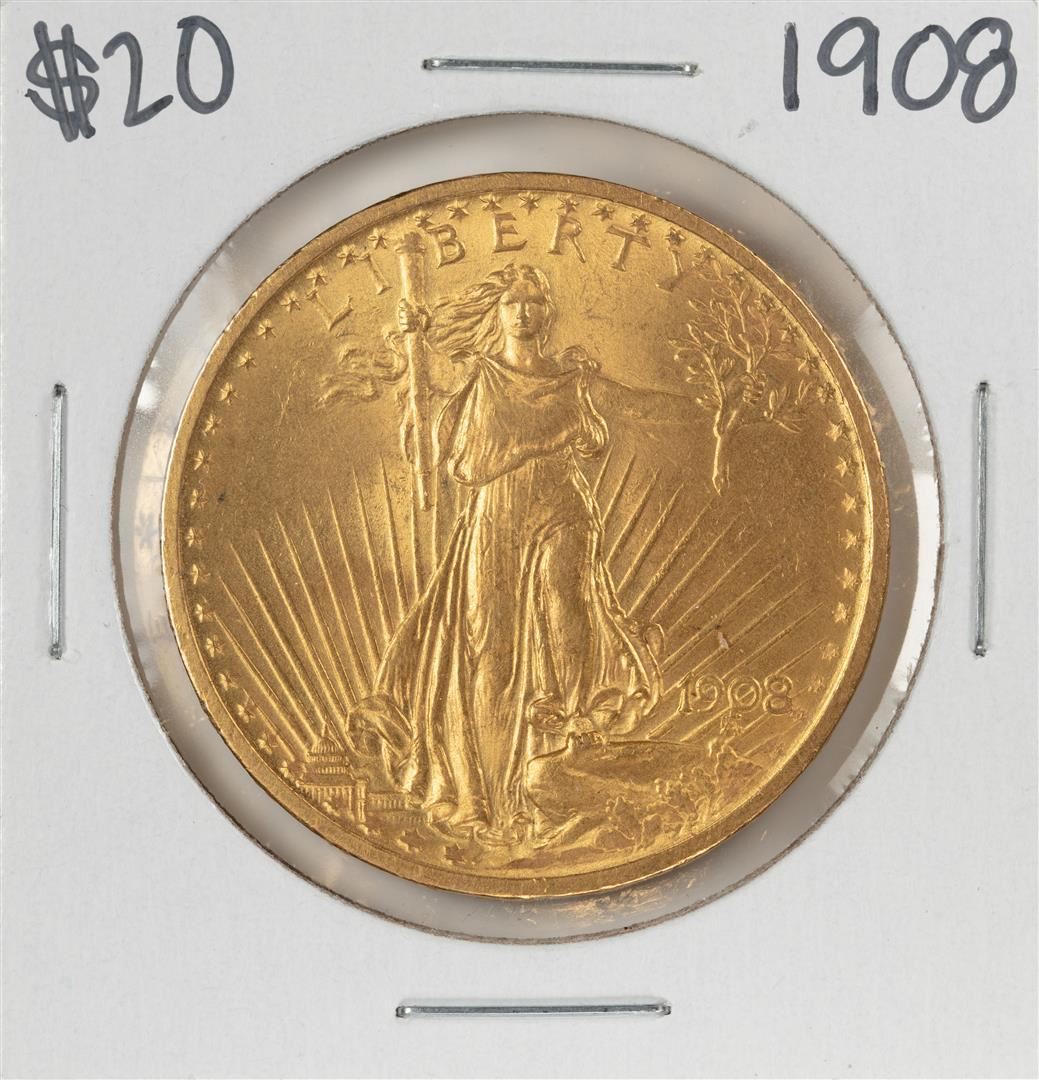 One 1908 $20 St. Gaudens Double Eagle Gold Coin.