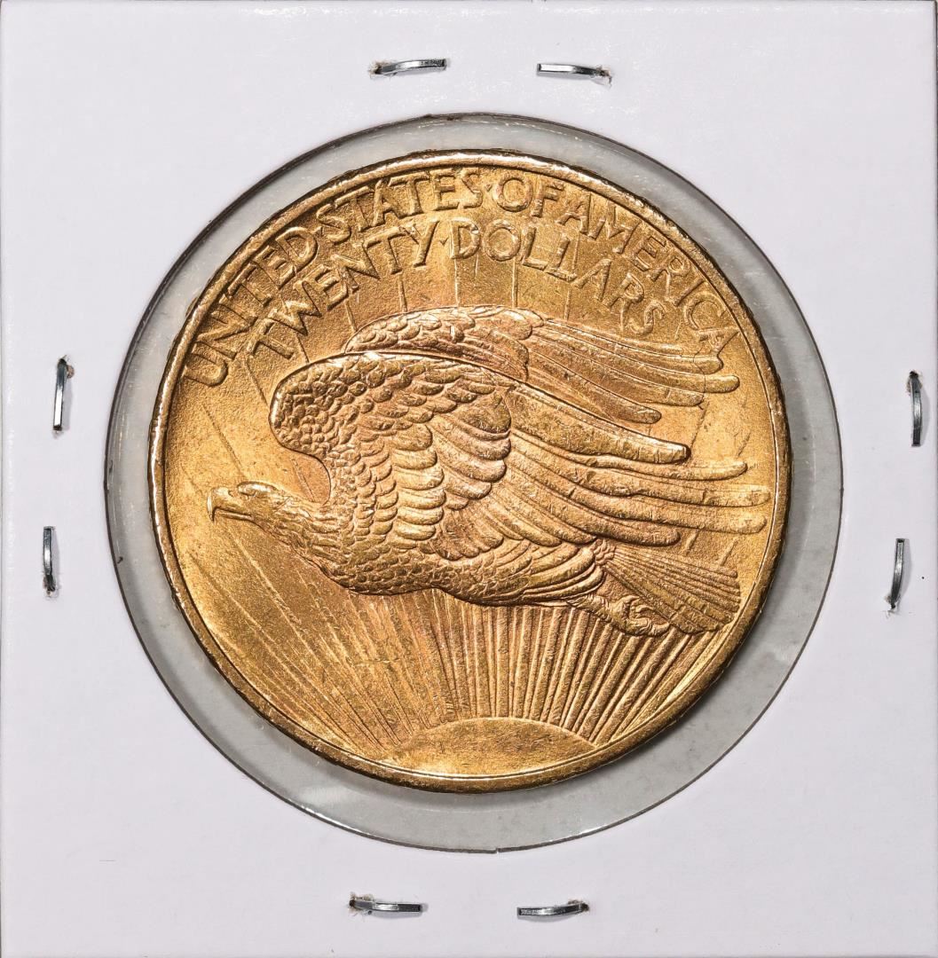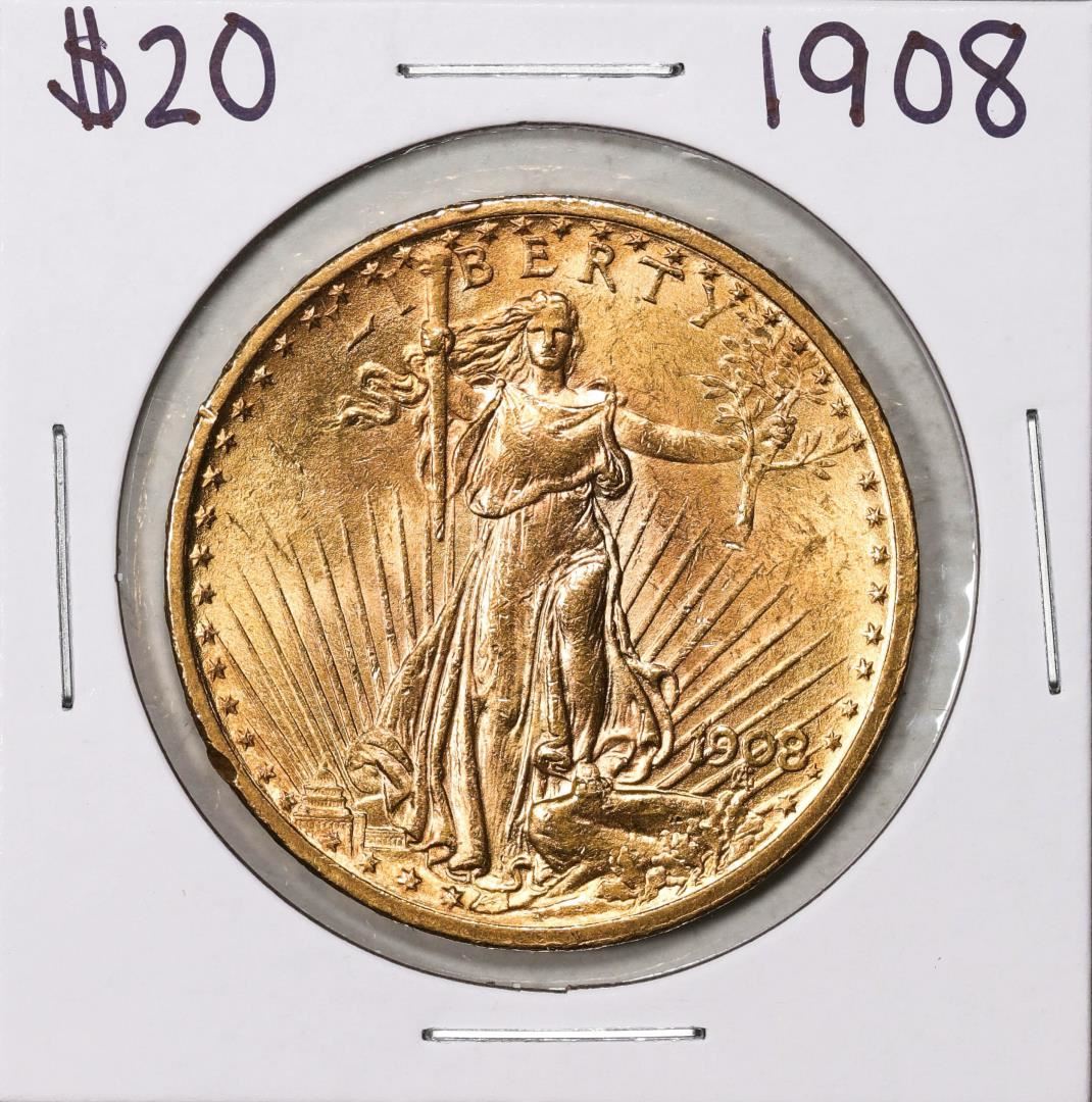 One 1908 $20 St. Gaudens Double Eagle Gold Coin.