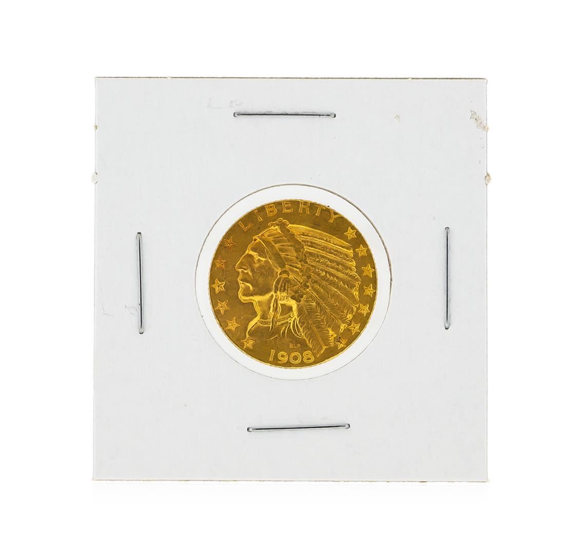 One 1908 $5 Indian Head Half Eagle Gold Coin.