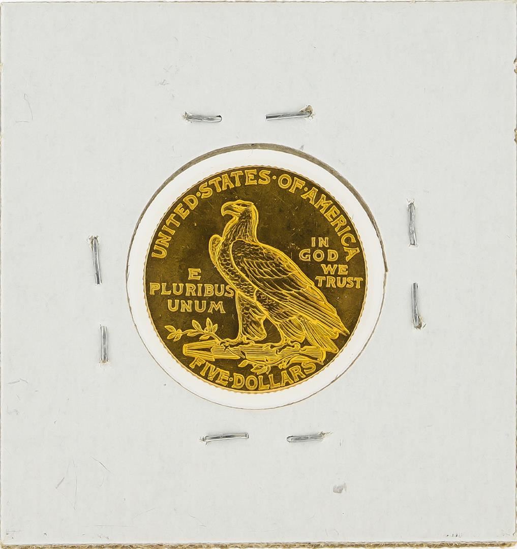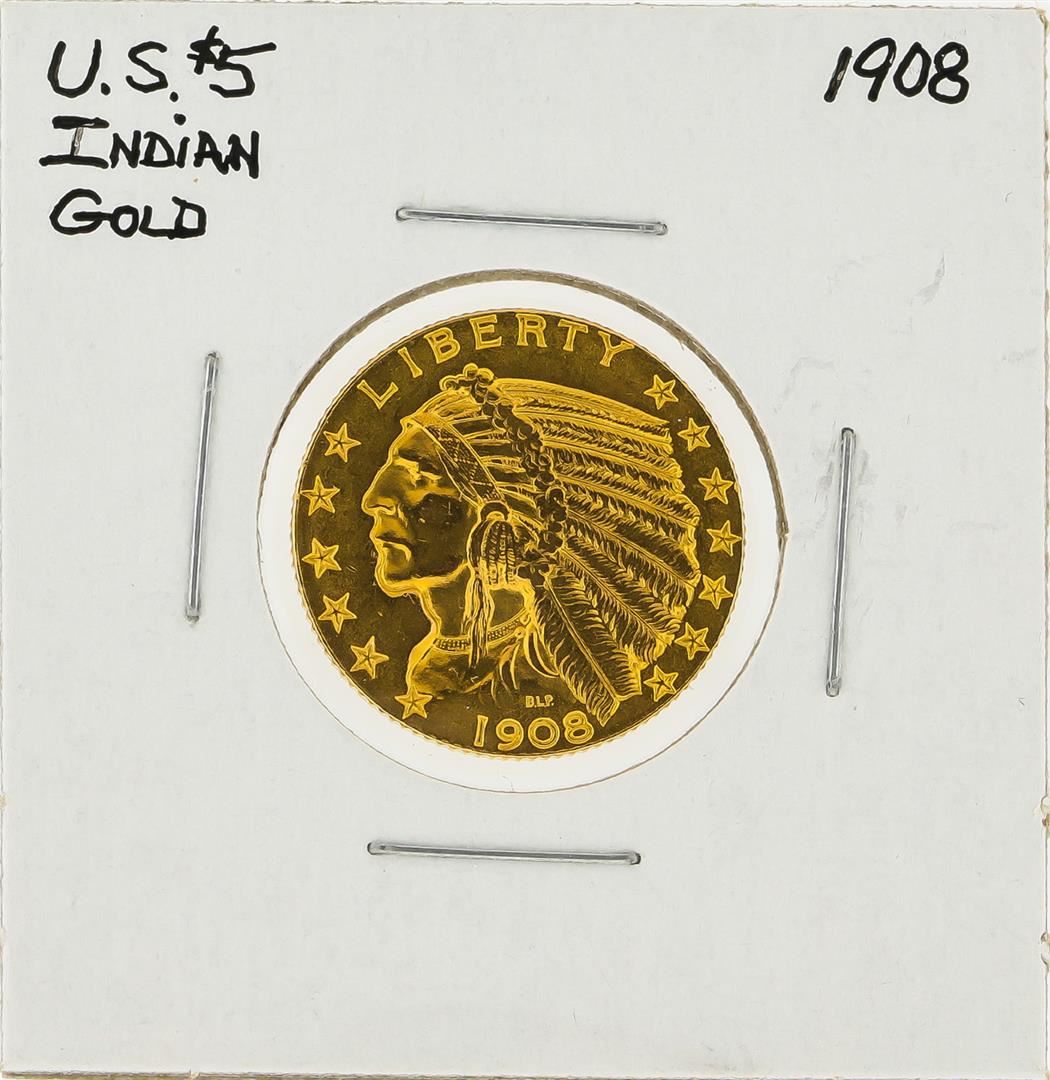 One 1908 $5 Indian Head Half Eagle Gold Coin.