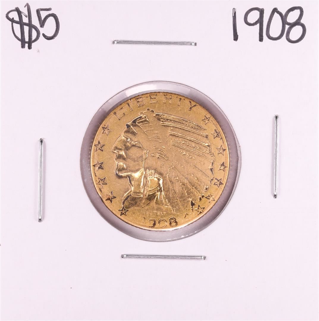 One 1908 $5 Indian Head Half Eagle Gold Coin.