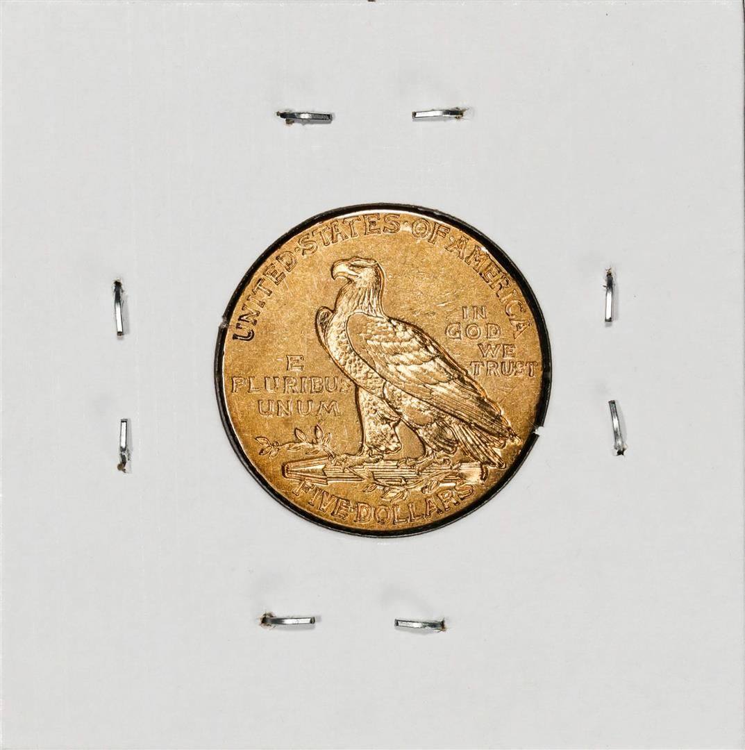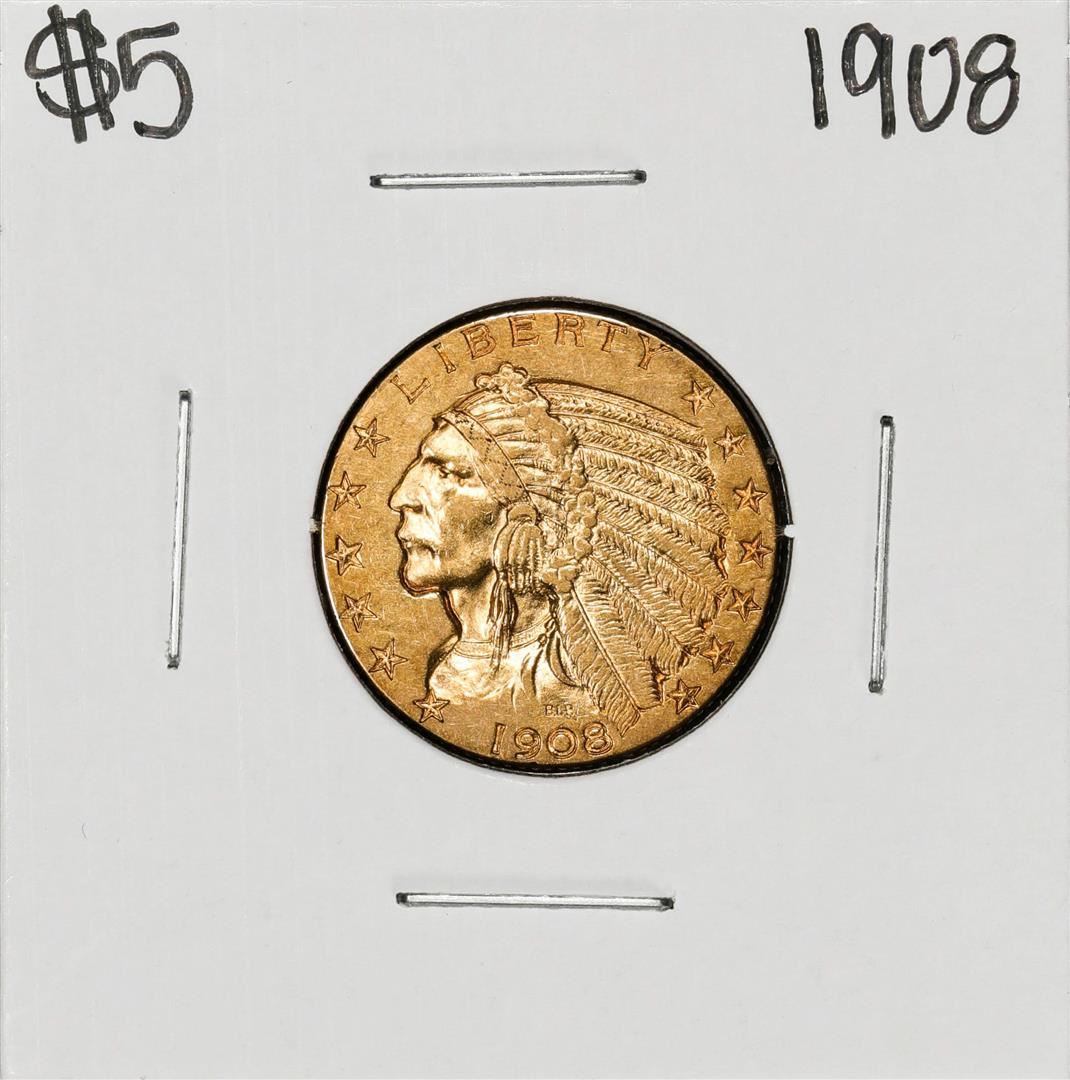 One 1908 $5 Indian Head Half Eagle Gold Coin.
