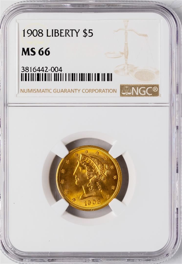 One 1908 $5 Liberty Head Half Eagle Gold Coin NGC MS66. NGC Certified.