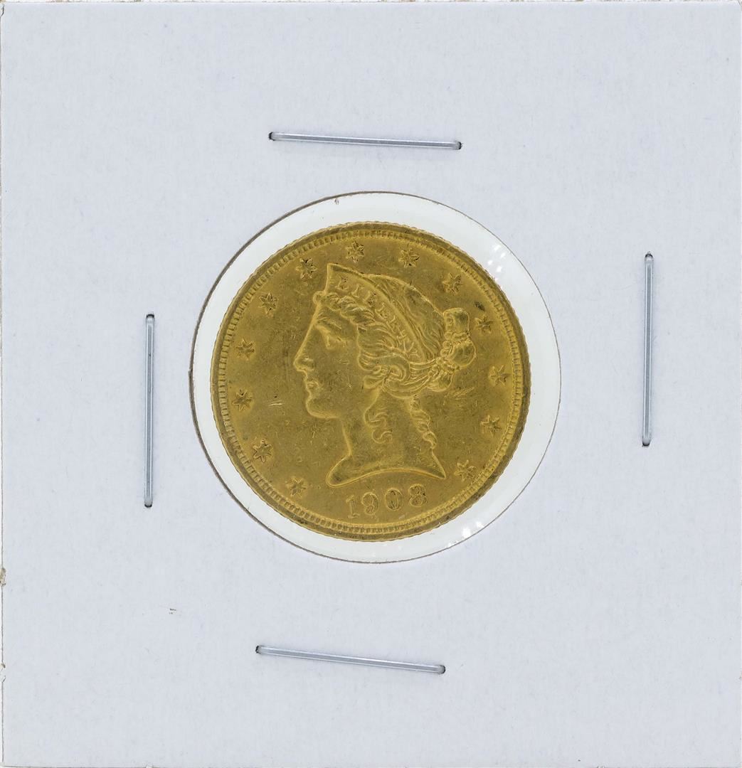 One 1908 $5 Liberty Head Half Eagle Gold Coin.