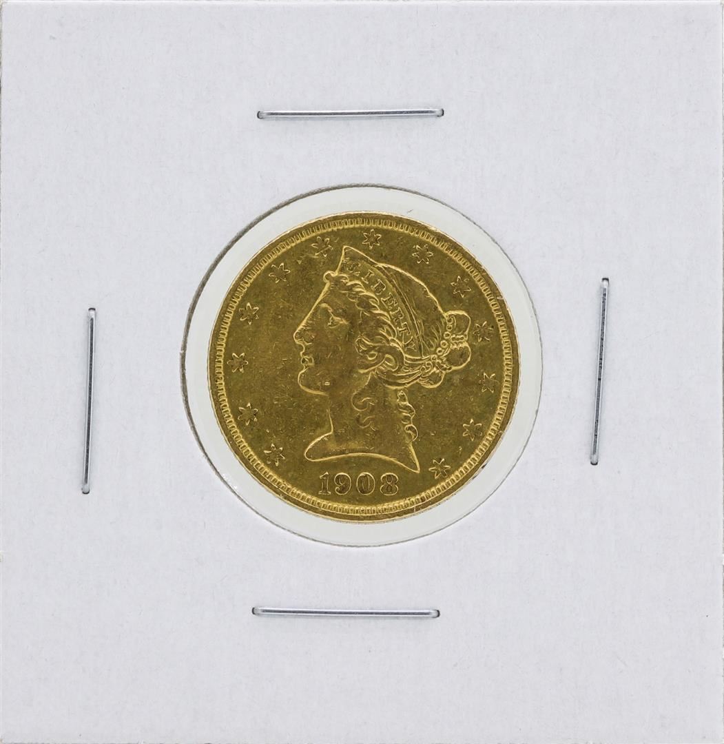 One 1908 $5 Liberty Head Half Eagle Gold Coin.
