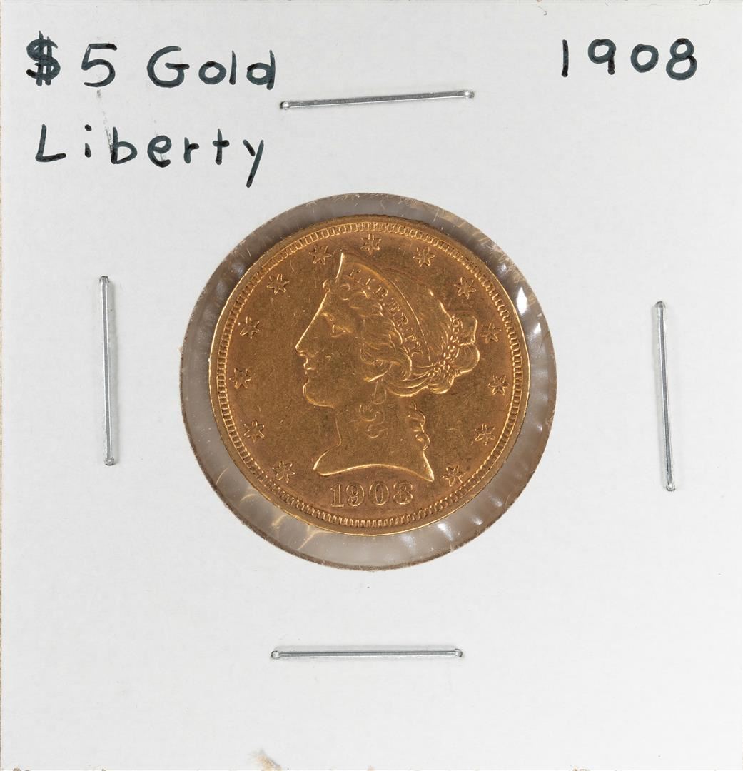 One 1908 $5 Liberty Head Half Eagle Gold Coin.