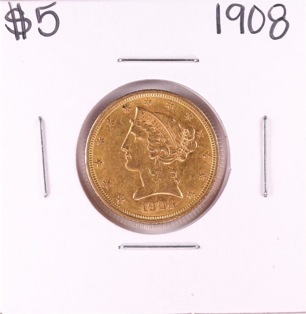 One 1908 $5 Liberty Head Half Eagle Gold Coin.