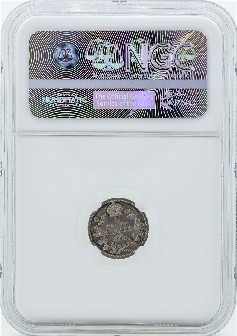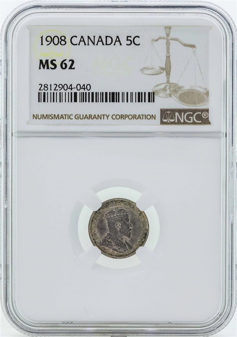 One 1908 Canada 5 Cents Coin NGC MS62. NGC Certified.