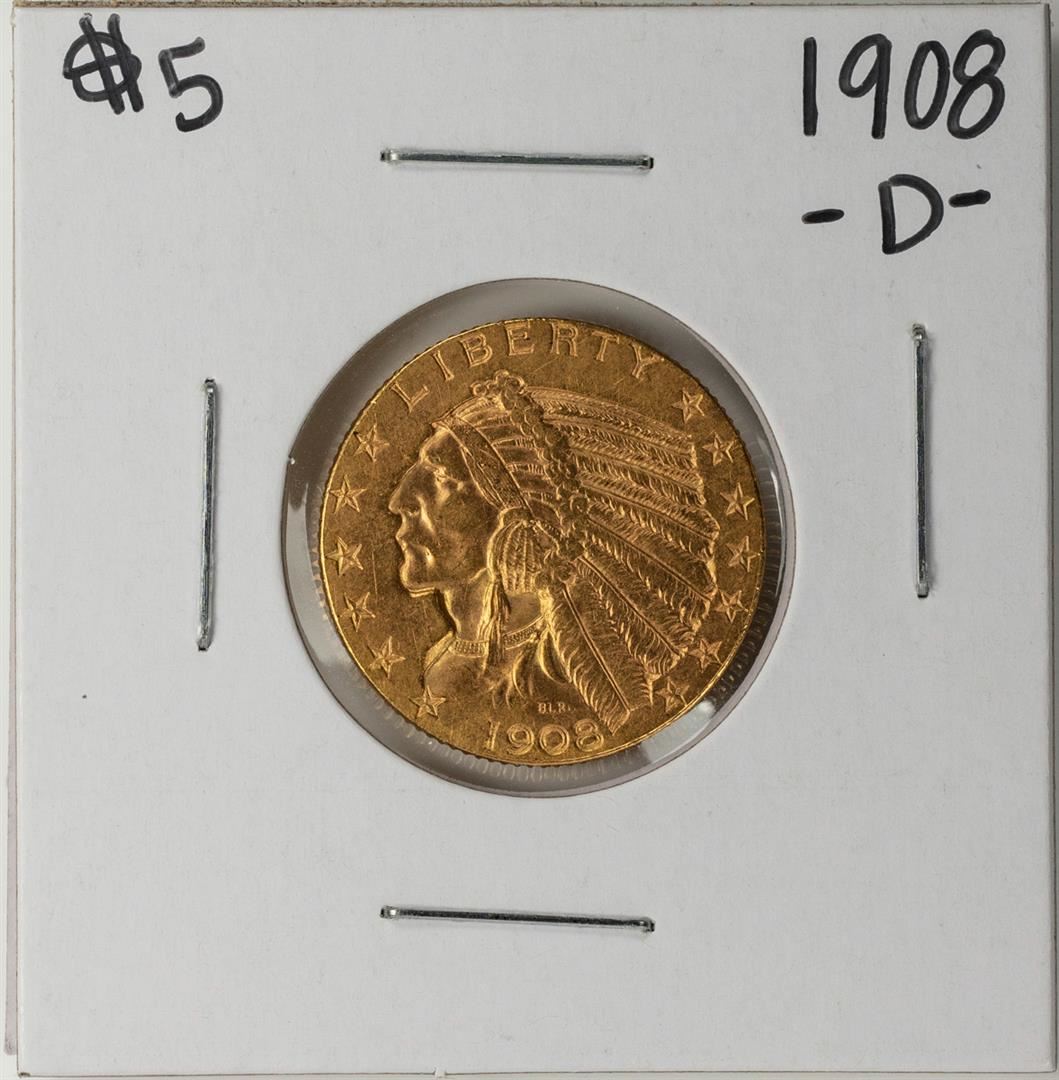 One 1908-D $5 Indian Head Half Eagle Gold Coin.