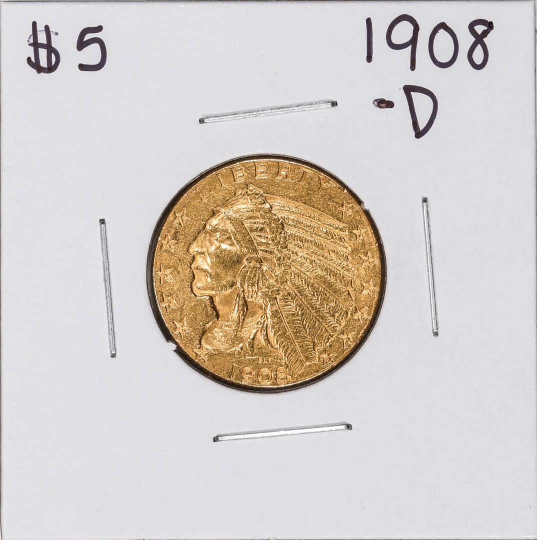 One 1908-D $5 Indian Head Half Eagle Gold Coin.