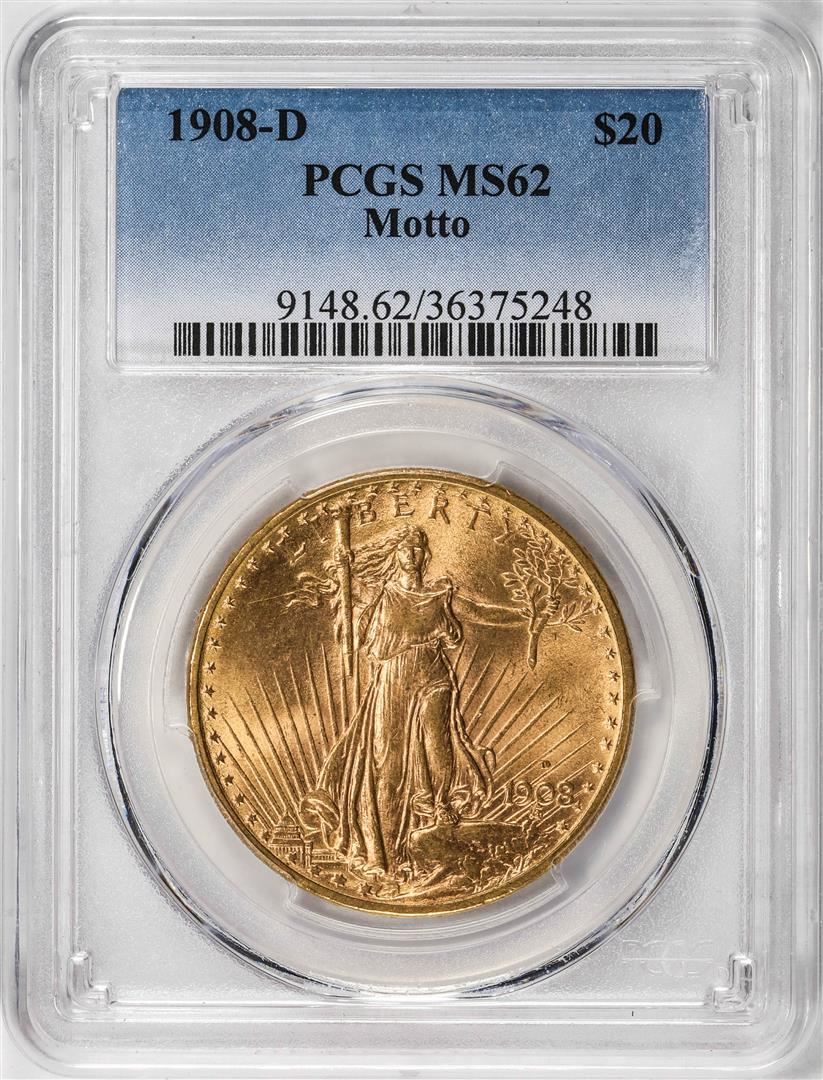 One 1908-D Motto $20 St Gaudens Double Eagle Gold Coin PCGS MS62. PCGS Graded.