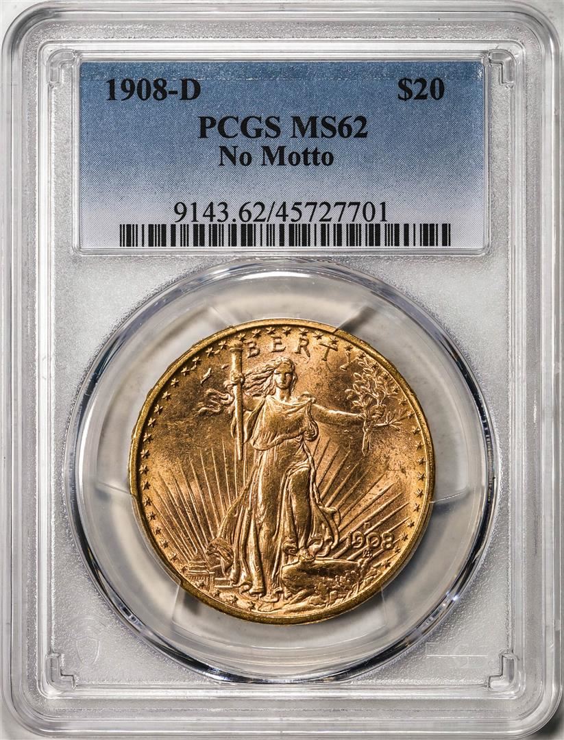 One 1908-D No Motto $20 St. Gaudens Double Eagle Gold Coin PCGS MS62. PCGS Graded.