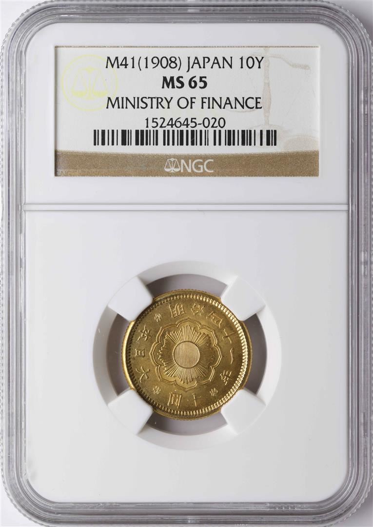 One 1908 M41 Japan 10 Yen Ministry of Finance Gold Coin NGC MS65. NGC Certified.