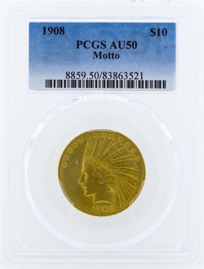One 1908 Motto $10 Indian Head Eagle Gold Coin PCGS AU50. PCGS Graded.