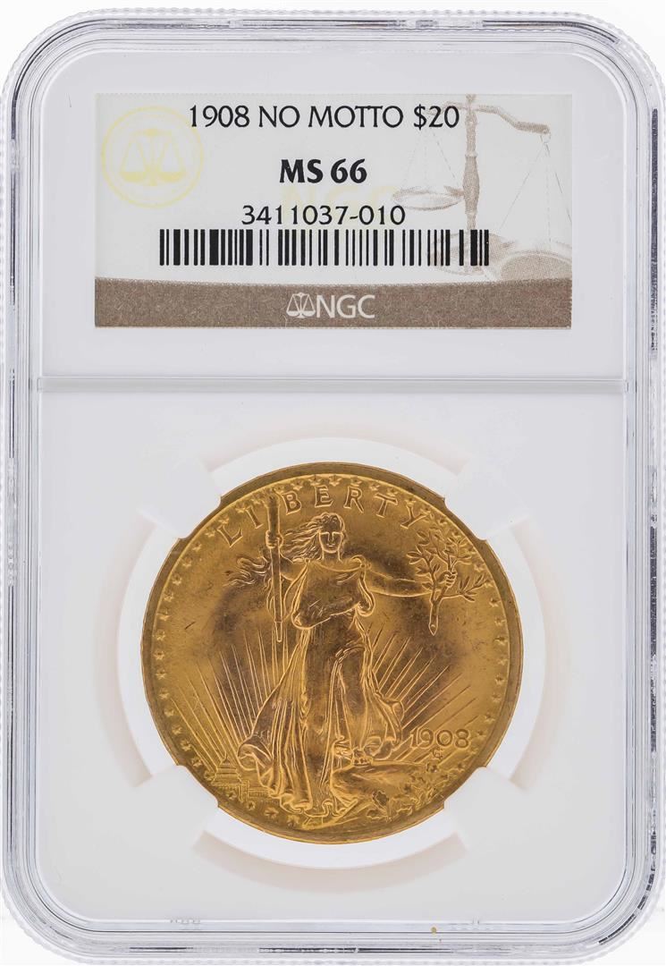 One 1908 NM $20 Saint Gaudens Double Eagle Gold Coin NGC MS66. NGC Certified.