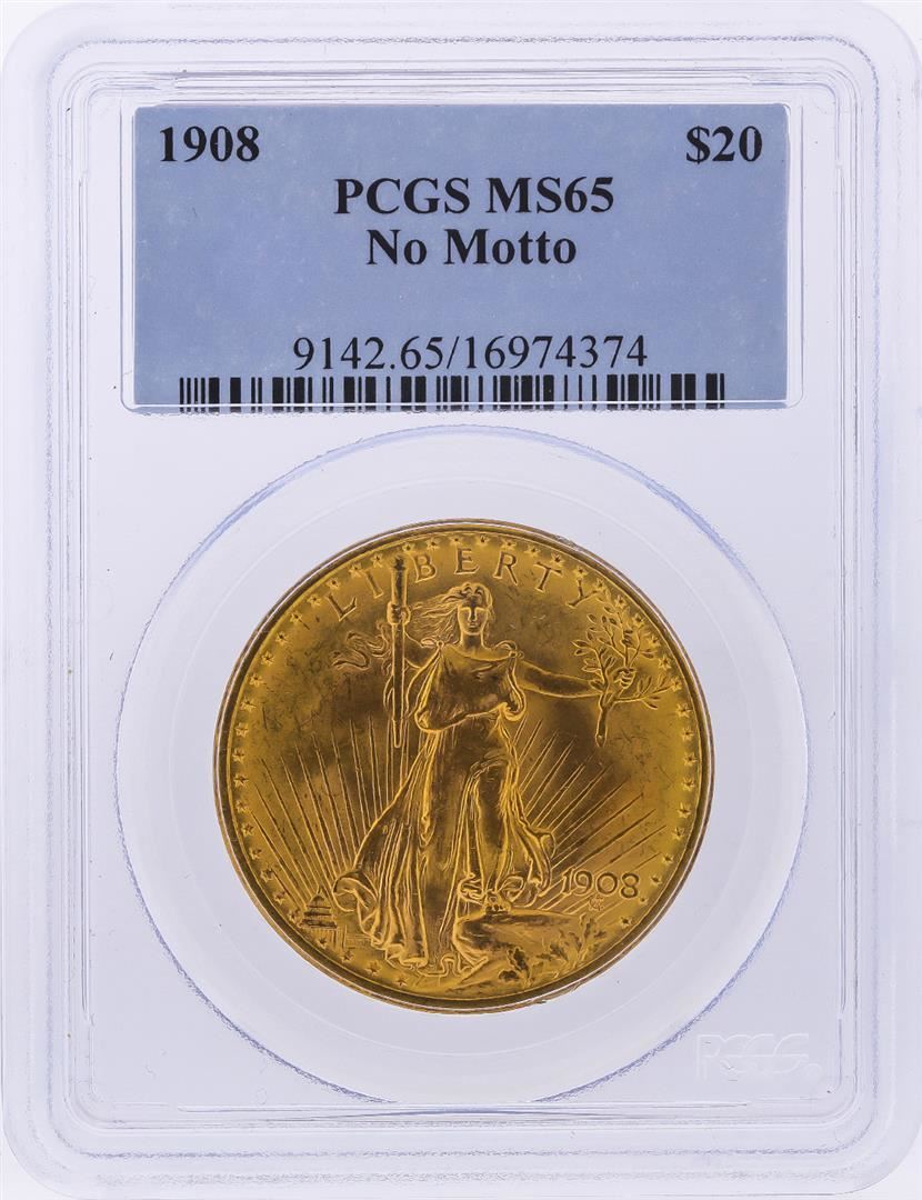 One 1908 NM $20 St. Gaudens Double Eagle Gold Coin PCGS MS65. PCGS Graded.