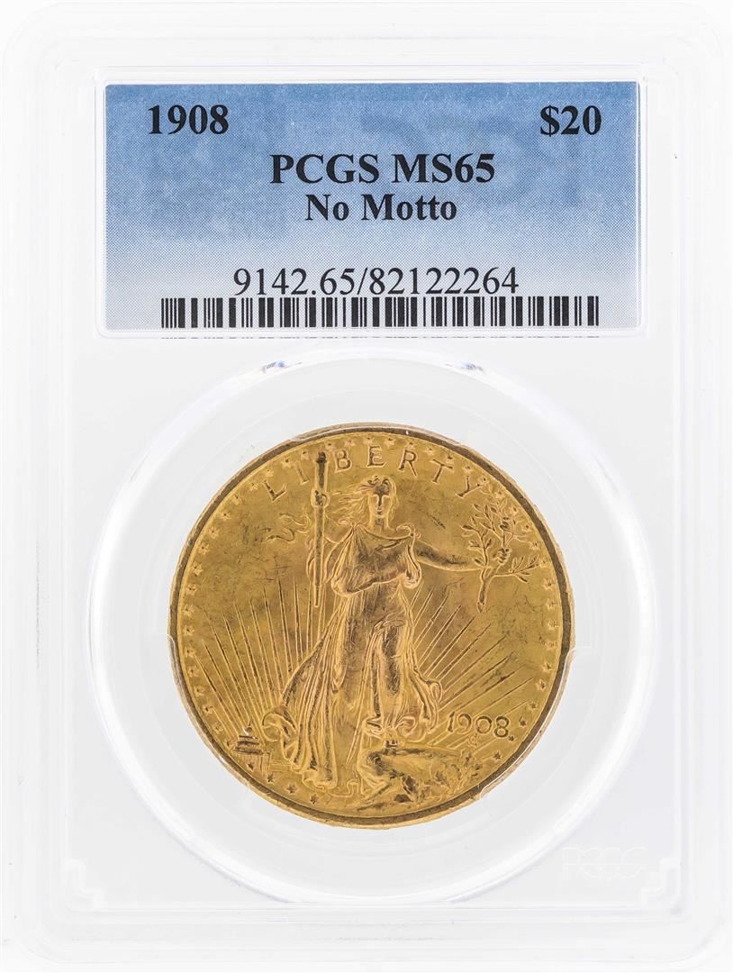 One 1908 NM $20 St. Gaudens Double Eagle Gold Coin PCGS MS65. PCGS Graded.