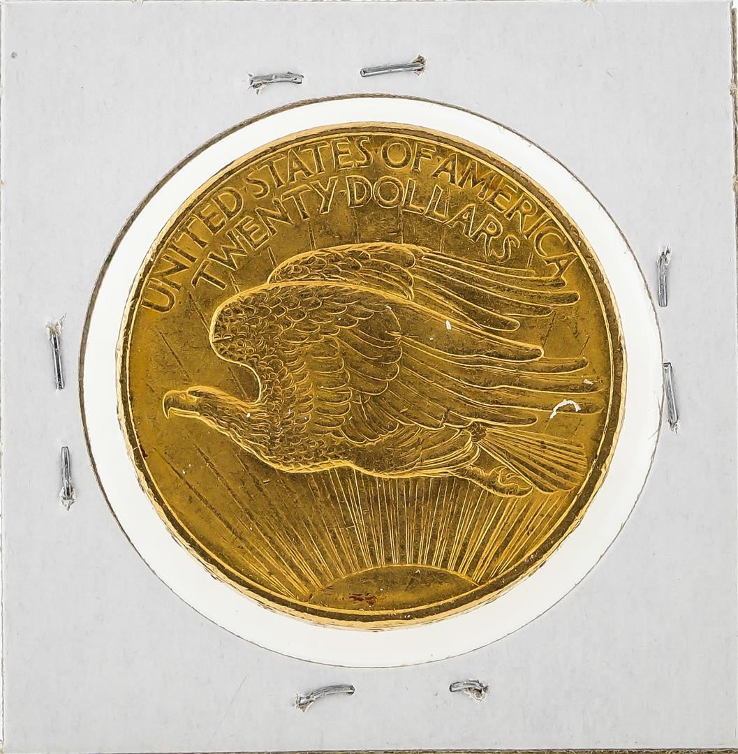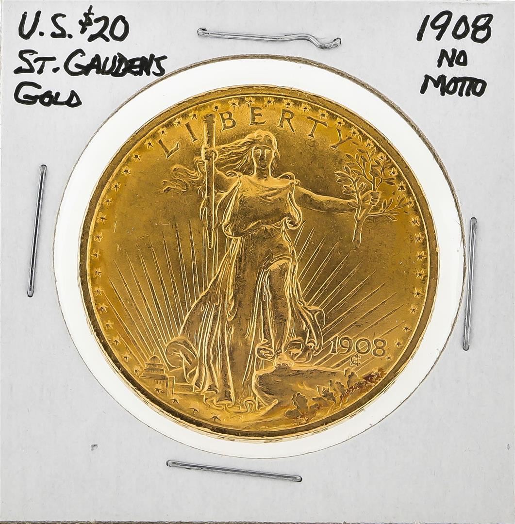 One 1908 NM $20 St. Gaudens Double Eagle Gold Coin.