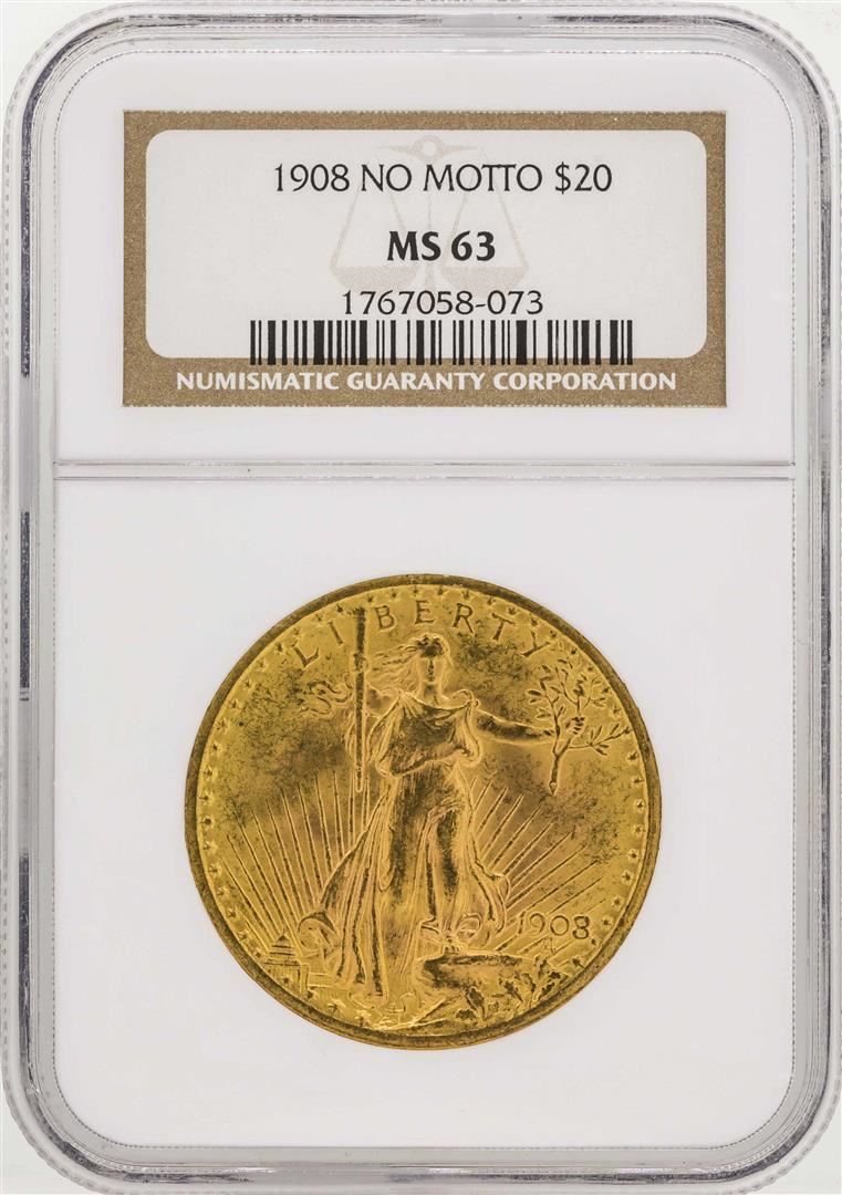 One 1908 No Motto $20 Saint Gaudens Double Eagle Gold Coin NGC MS63. NGC Certified.