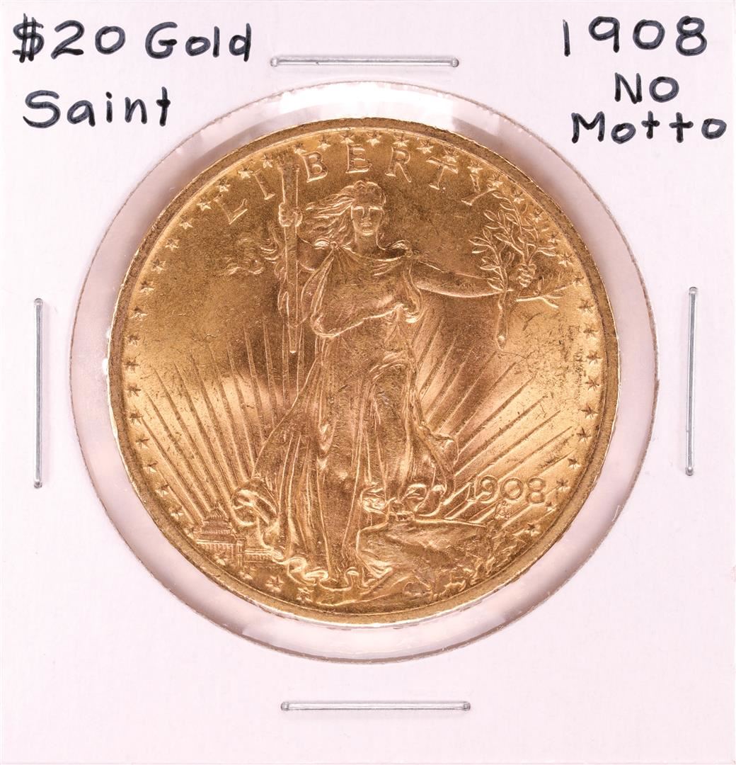 One 1908 No Motto $20 Saint Gaudens Double Eagle Gold Coin.