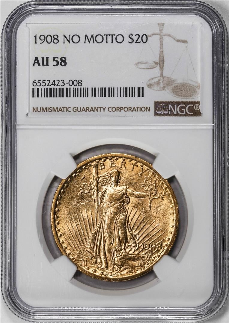 One 1908 No Motto $20 St. Gaudens Double Eagle Gold Coin NGC AU58. NGC Certified.