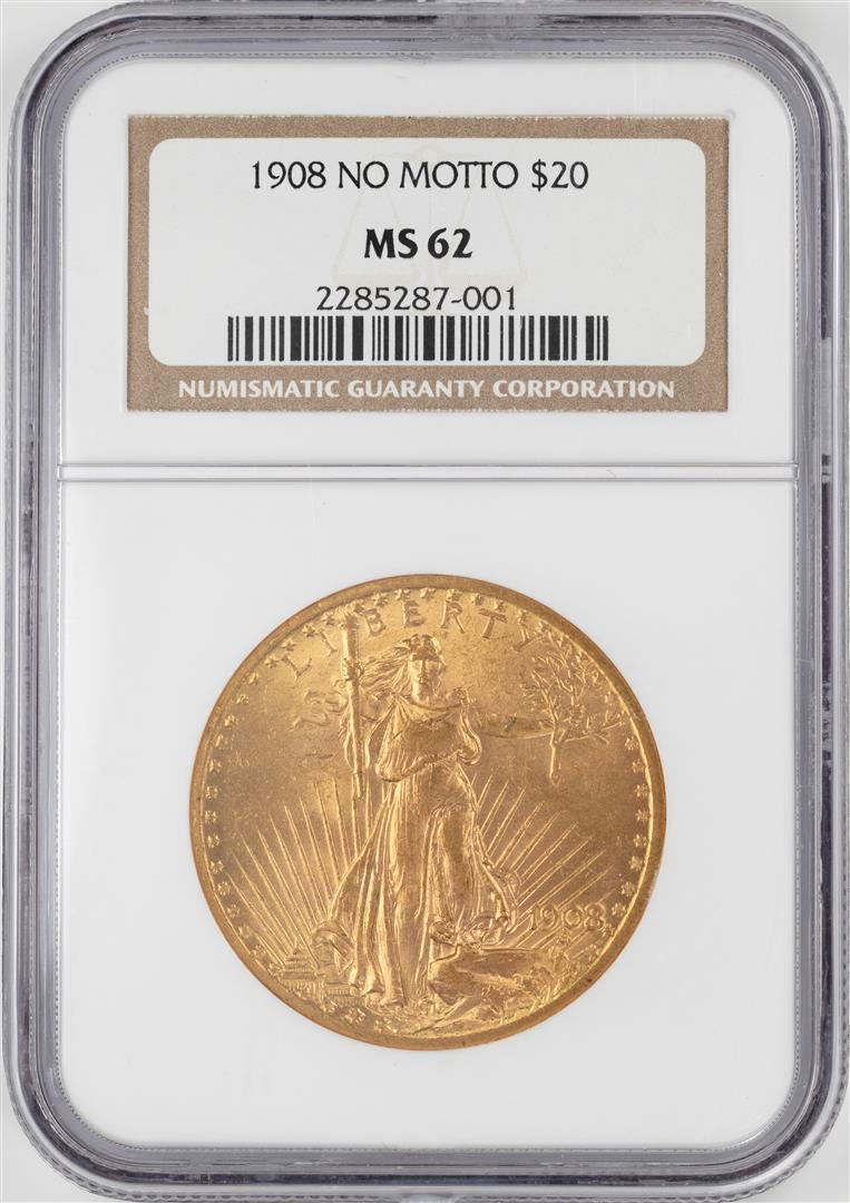 One 1908 No Motto $20 St. Gaudens Double Eagle Gold Coin NGC MS62. NGC Certified.
