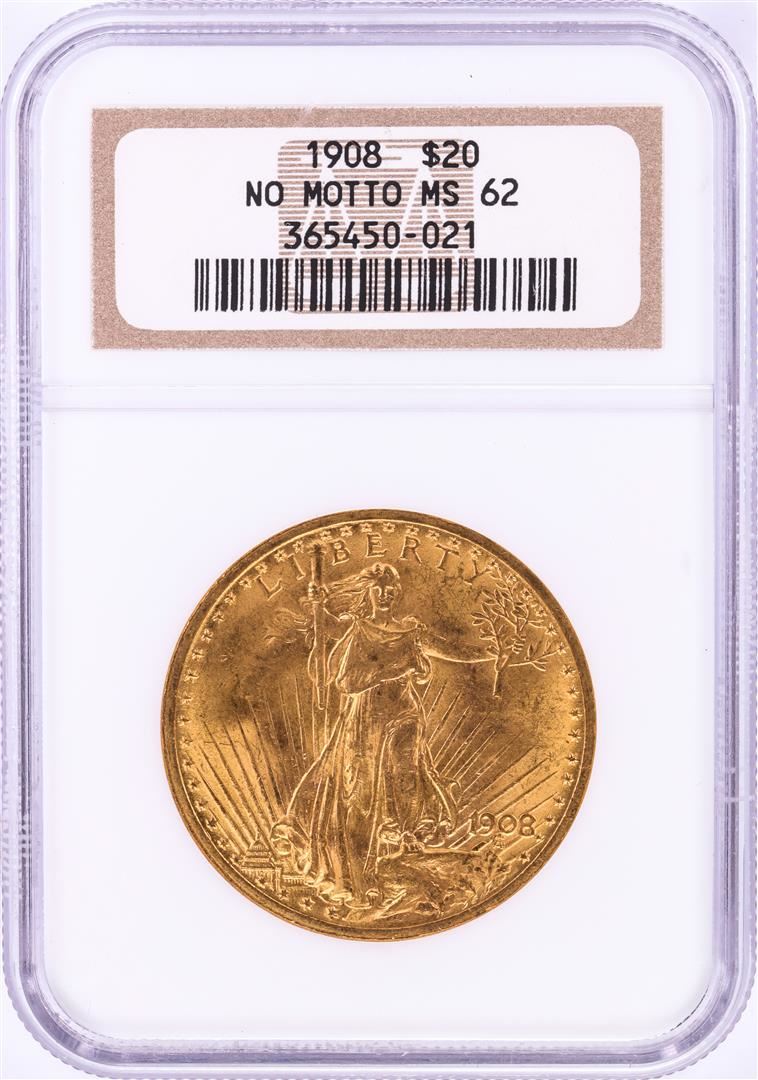 One 1908 No Motto $20 St. Gaudens Double Eagle Gold Coin NGC MS62. NGC Certified.