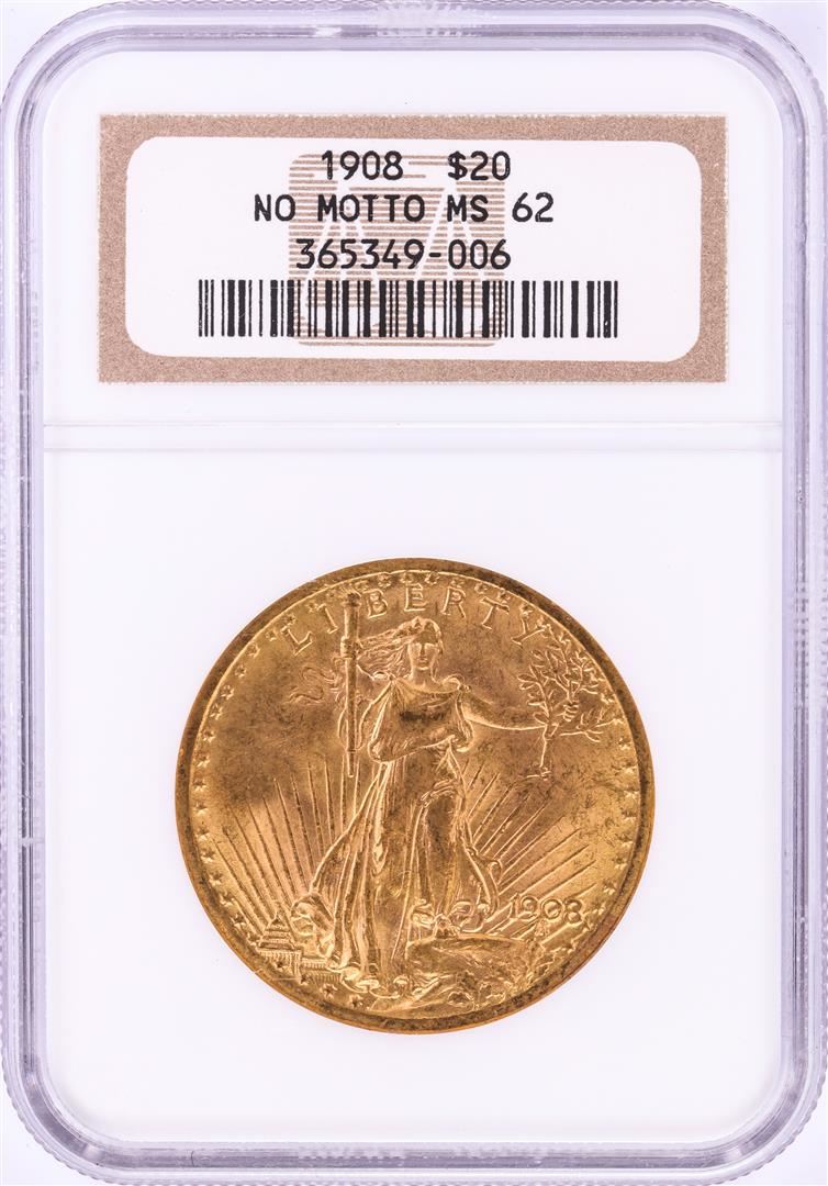 One 1908 No Motto $20 St. Gaudens Double Eagle Gold Coin NGC MS62. NGC Certified.