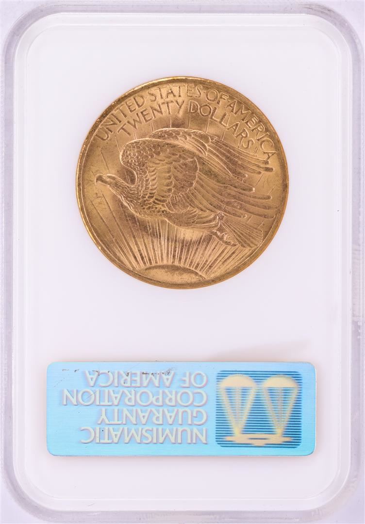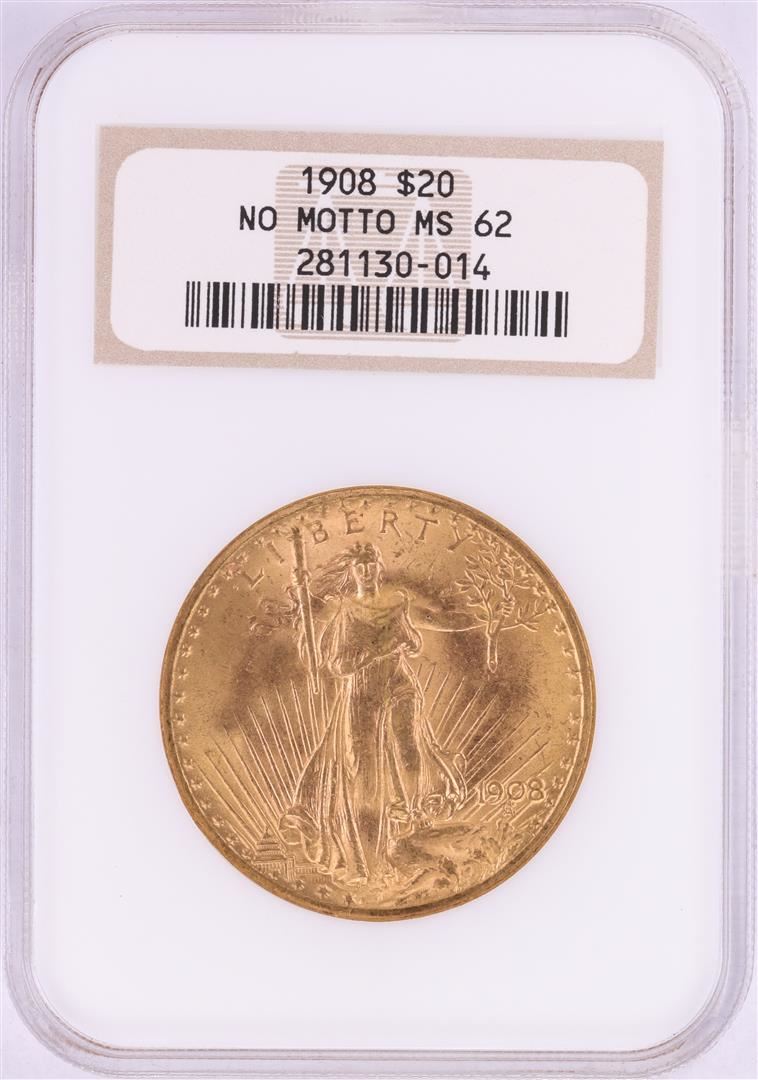 One 1908 No Motto $20 St. Gaudens Double Eagle Gold Coin NGC MS62. NGC Certified.