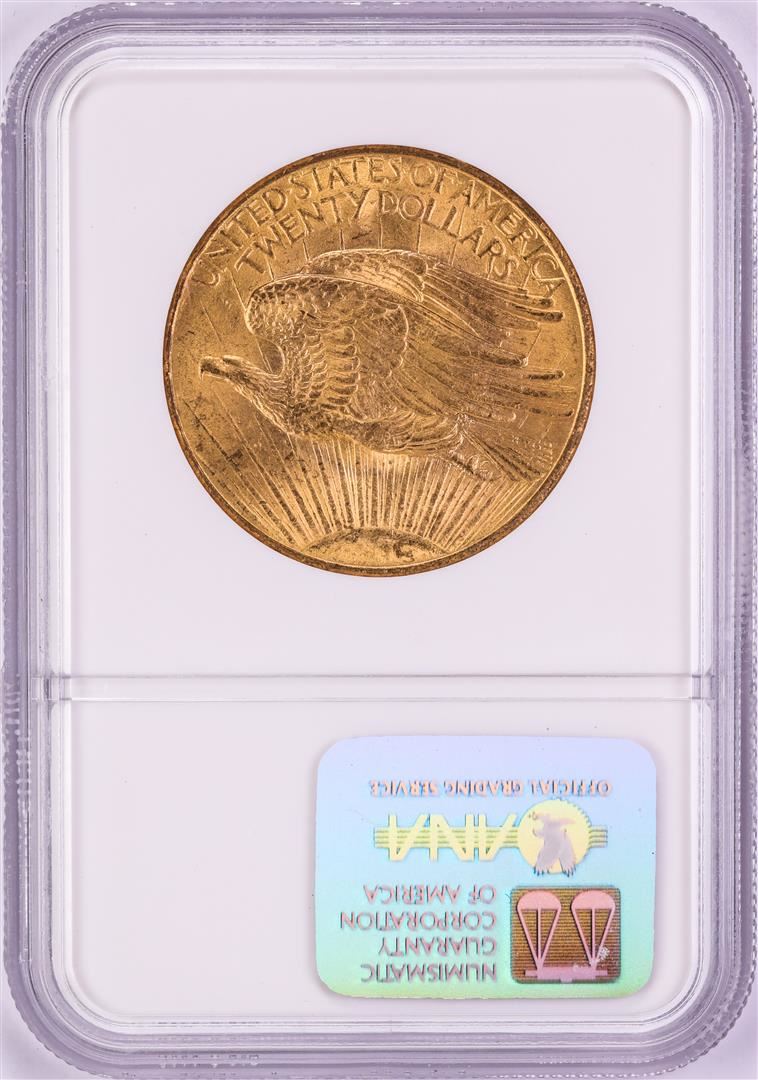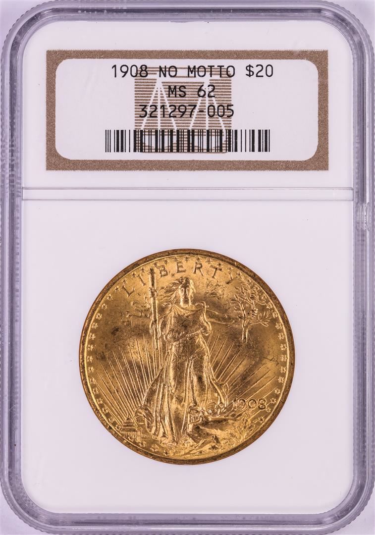 One 1908 No Motto $20 St Gaudens Double Eagle Gold Coin NGC MS62. NGC Certified.