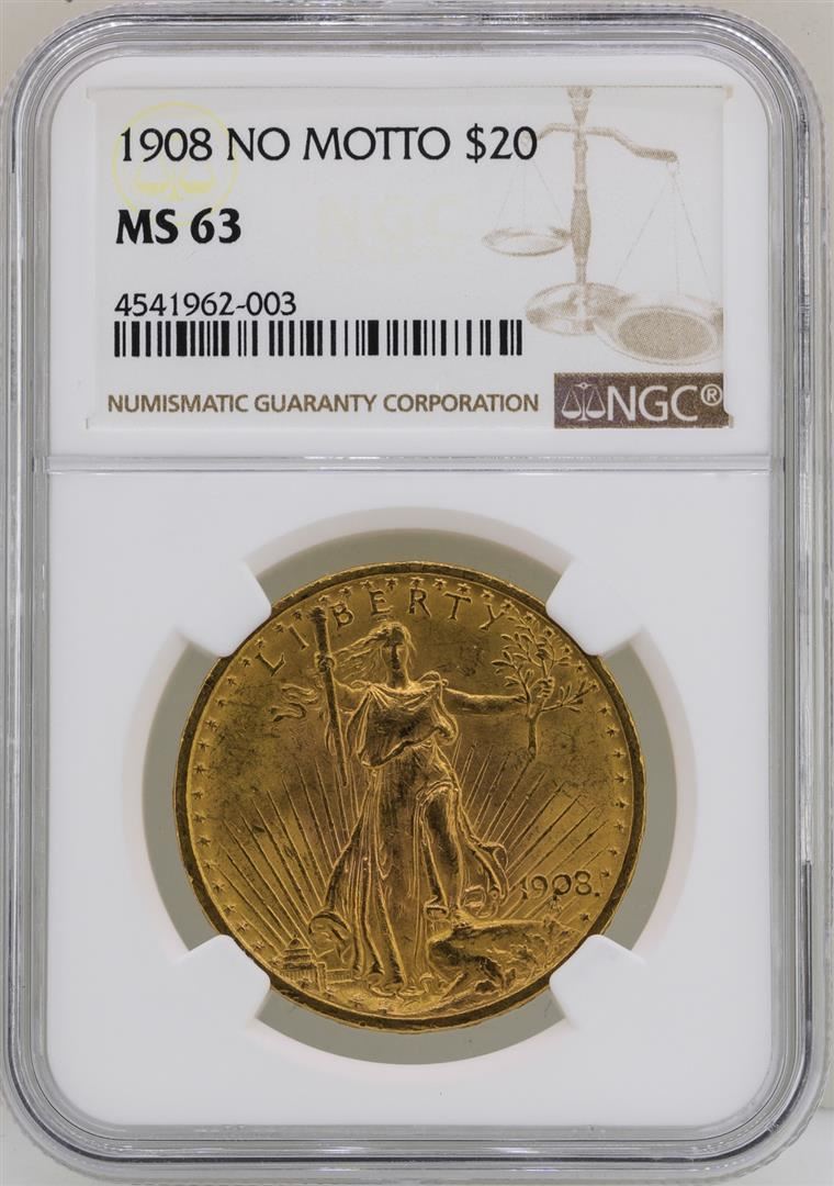 One 1908 No Motto $20 St. Gaudens Double Eagle Gold Coin NGC MS63. NGC Certified.