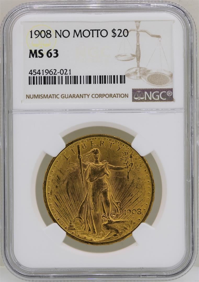 One 1908 No Motto $20 St. Gaudens Double Eagle Gold Coin NGC MS63. NGC Certified.