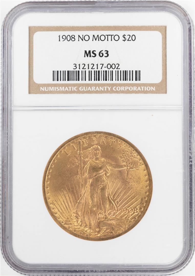One 1908 No Motto $20 St. Gaudens Double Eagle Gold Coin NGC MS63. NGC Certified.