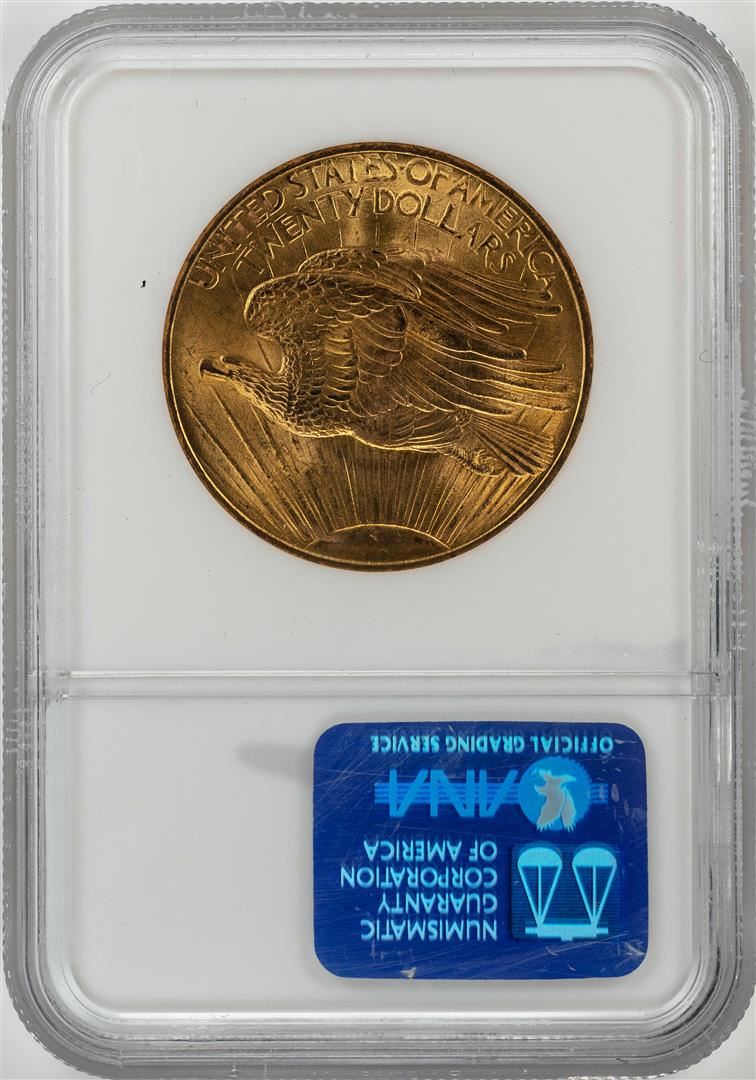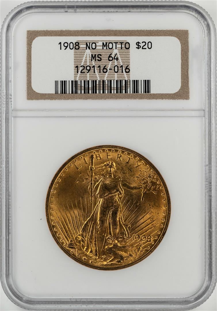 One 1908 No Motto $20 St. Gaudens Double Eagle Gold Coin NGC MS64. NGC Certified.
