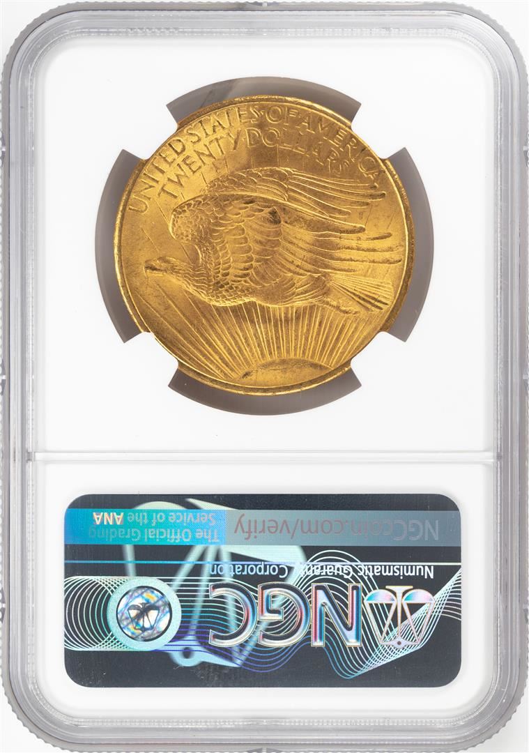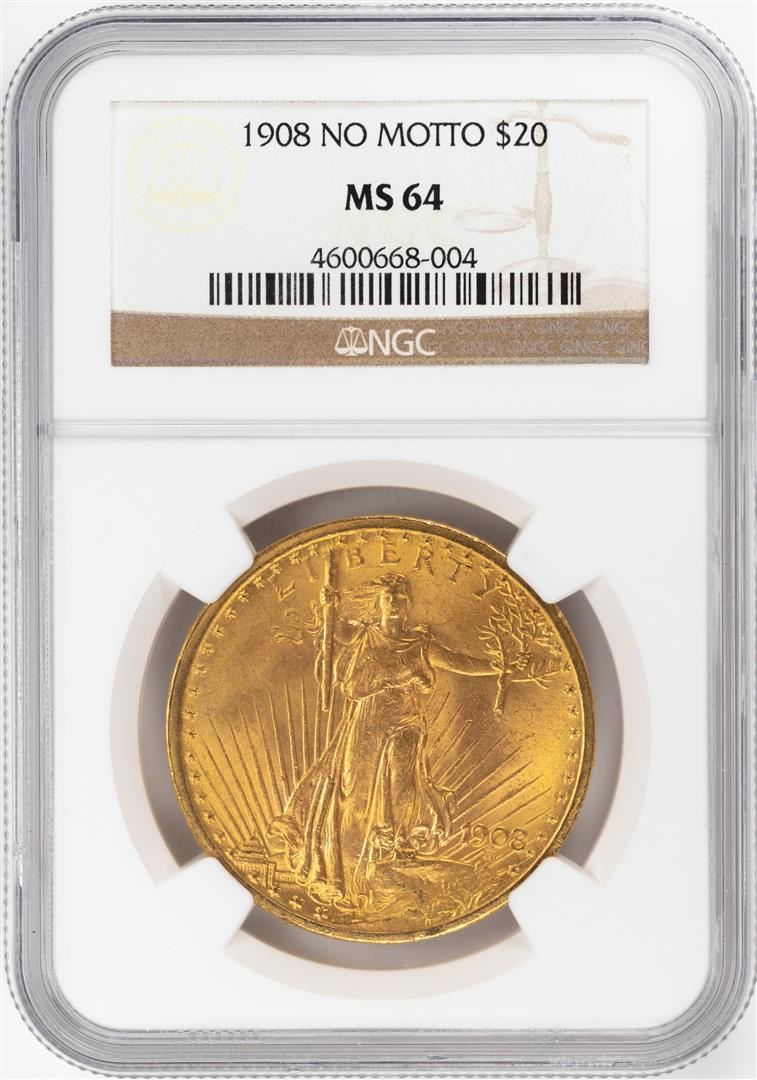 One 1908 No Motto $20 St. Gaudens Double Eagle Gold Coin NGC MS64. NGC Certified.