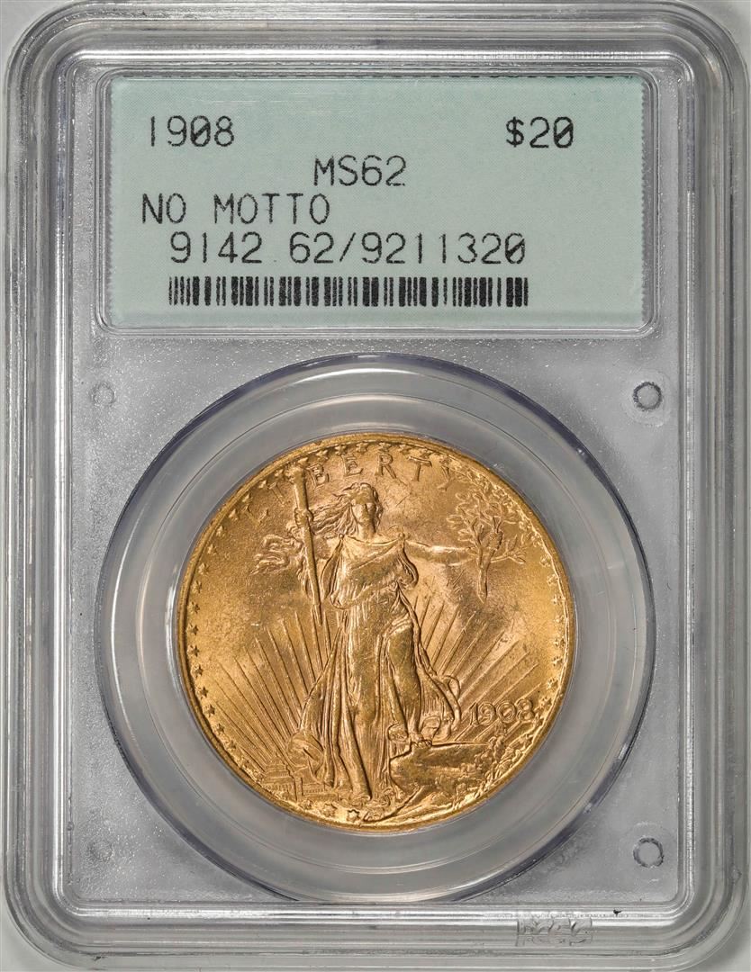 One 1908 No Motto $20 St. Gaudens Double Eagle Gold Coin PCGS MS62 Old Green Holder. PCGS Graded.