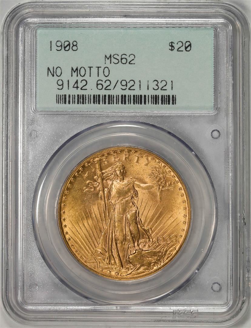 One 1908 No Motto $20 St. Gaudens Double Eagle Gold Coin PCGS MS62 Old Green Holder. PCGS Graded.