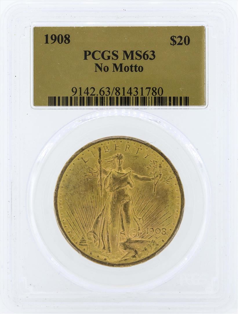 One 1908 No Motto $20 St. Gaudens Double Eagle Gold Coin PCGS MS63. PCGS Graded.