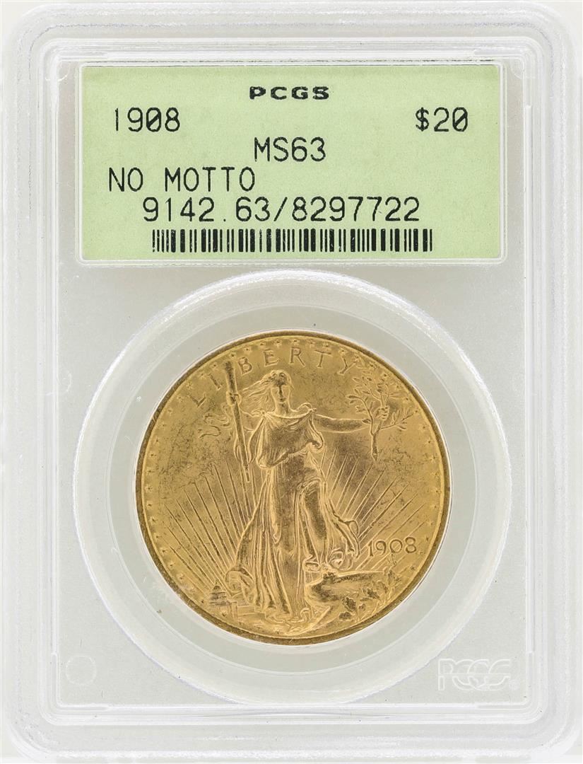 One 1908 No Motto $20 St. Gaudens Double Eagle Gold Coin PCGS MS63. PCGS Graded.